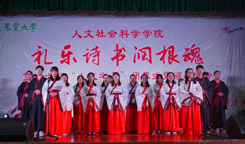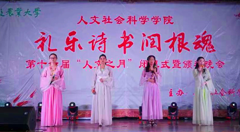本次晚会经过精心筹备,学生表演各展风采,歌舞极具人文特色,身着长袍广袖的人文学子跳起开场舞《棠梨煎雪》,优雅唯美。回顾式视频和微信墙等活动穿插,将全场晚会分为三个模块:古韵留香、恰少年时和圆梦未来。朗诵《记得吗,你的名字叫炎黄》,道出炎黄子孙代代相传的傲骨;《贝加尔湖畔》天籁般的声音久久回荡在礼堂上空,意韵不绝;《春风十里》让全场的气氛达到最高点,乐队配合默契,加上主唱完美地演绎,让现场观众感受到了青春的气息。晚会在庄严肃穆的《礼仪之邦》中落幕。 本次晚会还进行了人文之月期间内进行的国学大擂台、一带一路知多少、涉农法律知识竞赛等比赛的颁奖典礼。