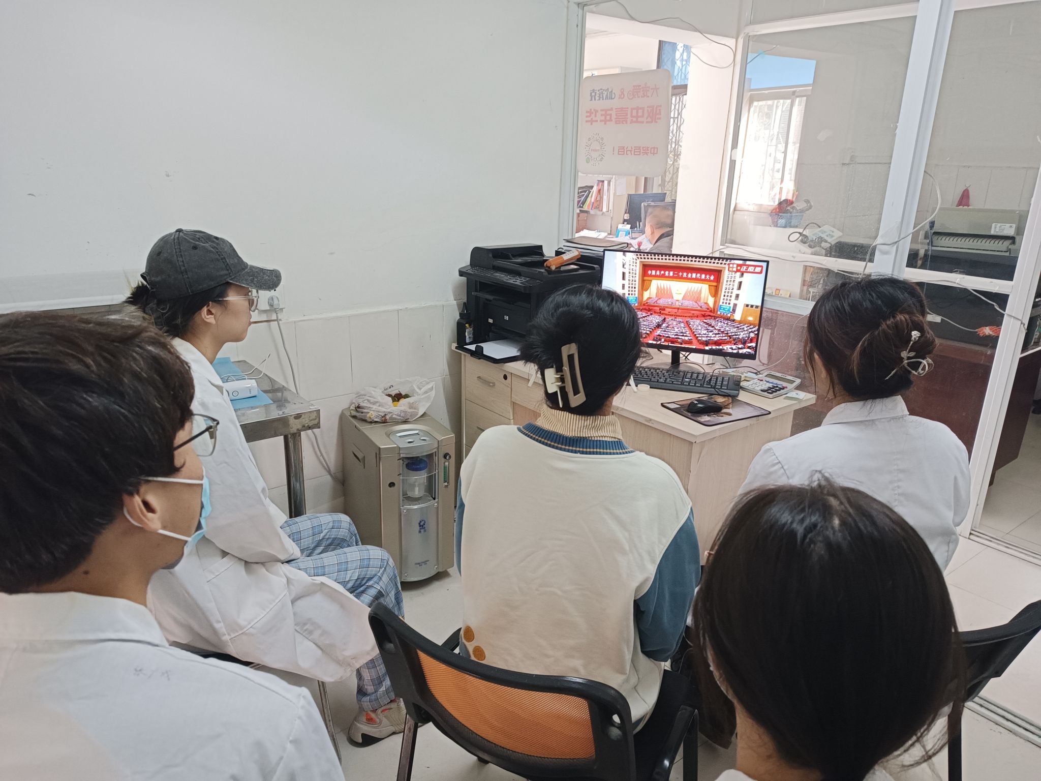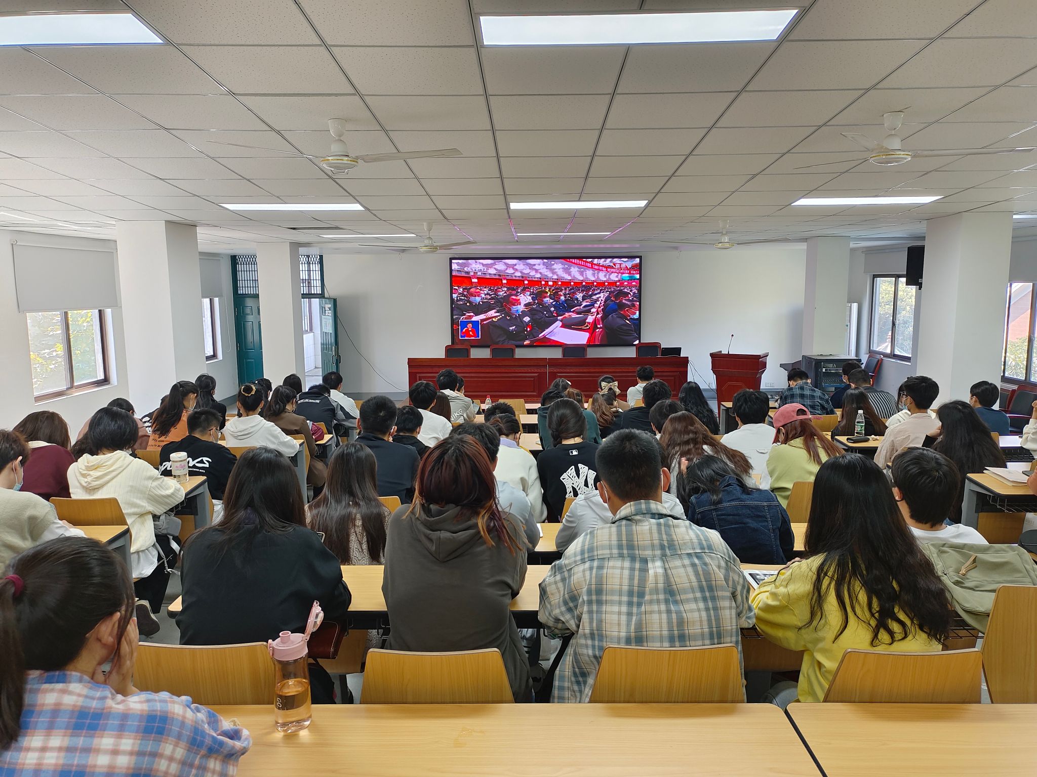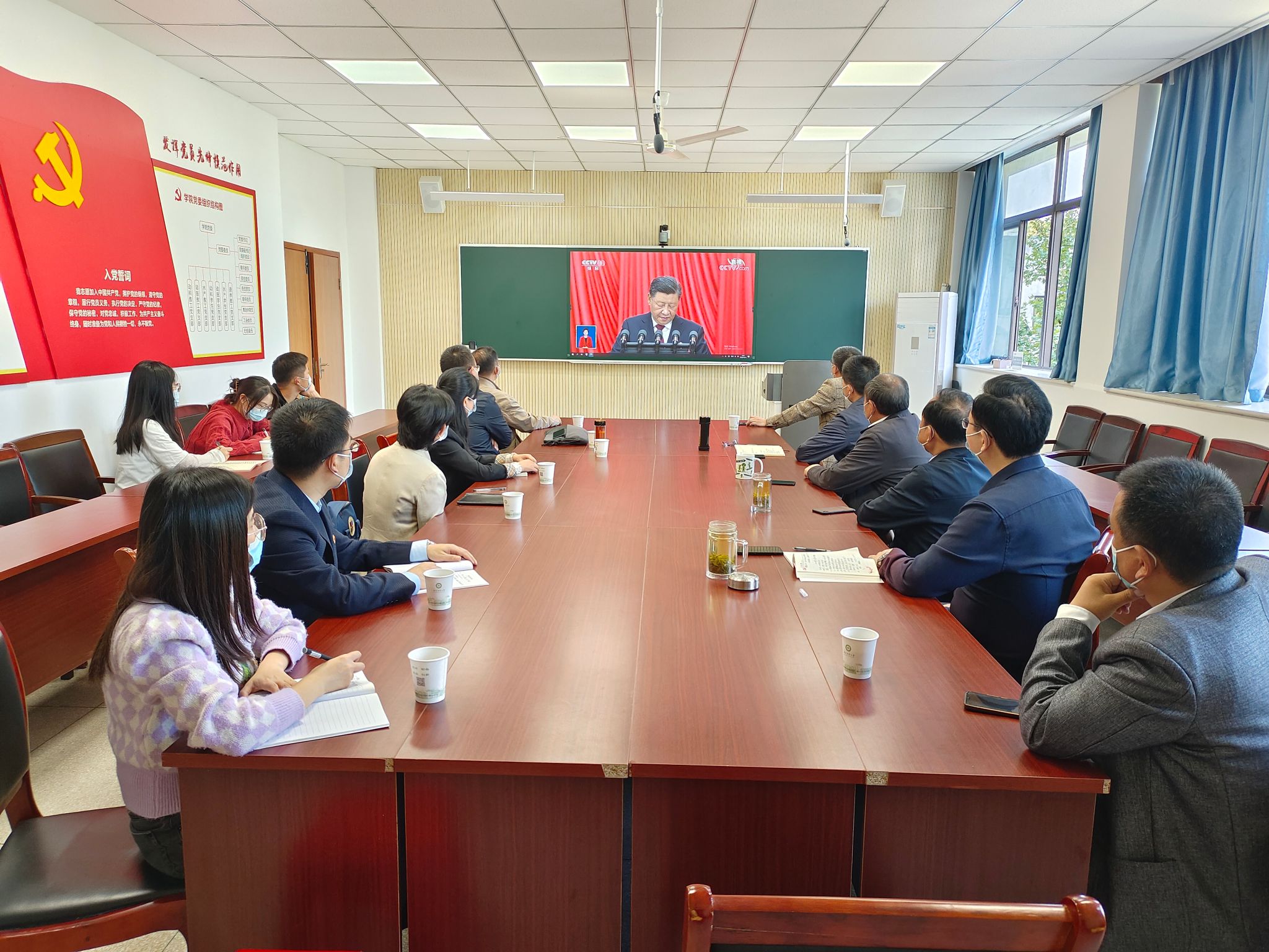 上午10时,学院领导班子、党委委员、纪委委员、教师和学生代表在学院306会议室开展集体学习观看活动;学院团委组织团支部书记、学生骨干在318教室开展学习观看活动;各党支部、各团支部和学生班级采取多种形式收听收看。
