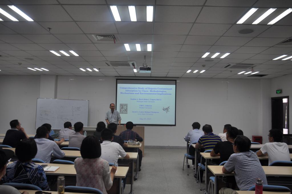 报告会上,李晖教授介绍了有机污染物土壤吸附的发展历程;从环境化学的角度重点阐述了蒙脱石吸附非极性芳香化合物的层间吸附机制,并用巧妙的实验证实并定量计算土壤黏土矿物吸附自然土壤中的有机化合物。报告还就黏土中K+/Ca2+层间吸附交换机理在控制农药和硝基芳香化合物在土壤中的移动性及其对靶标生物的有效性方面进行了阐述。