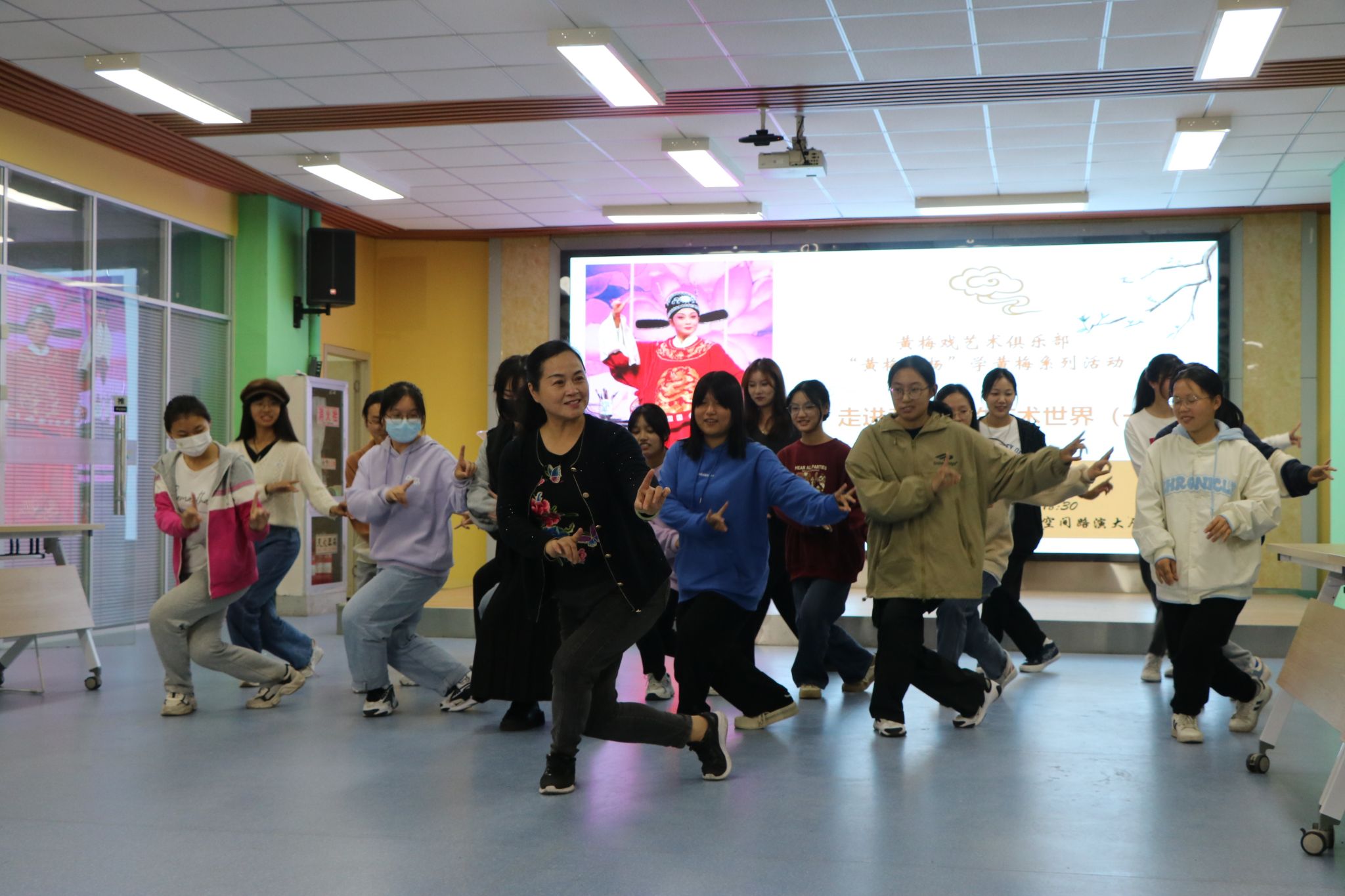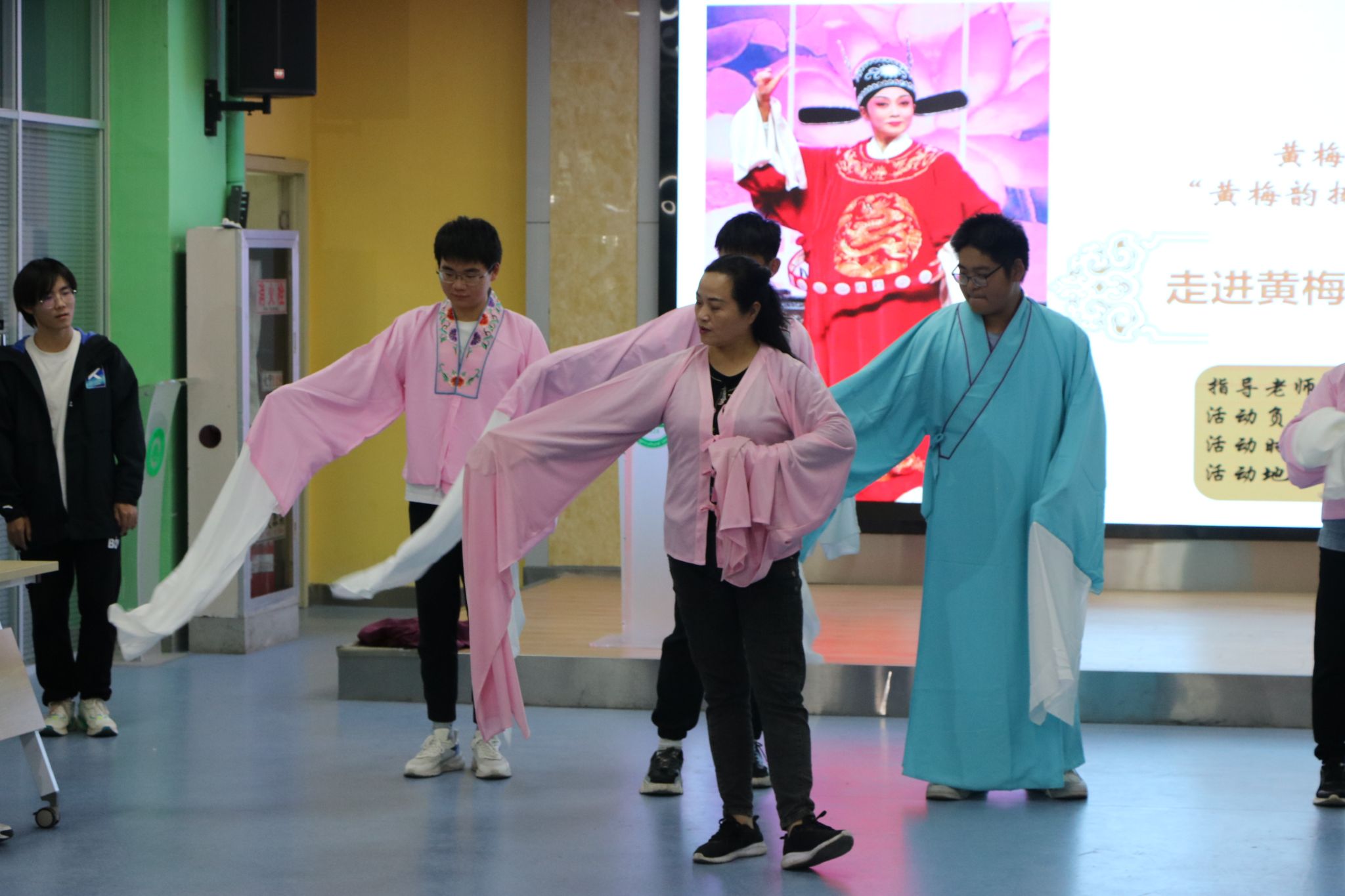活动以师生互动演唱经典黄梅戏选段开场,随后,黄家英带领同学们演示戏曲基本功“手眼身法步”——戏曲中的台步、肢体语言“照镜子”“梳头发”等。以《谁料黄榜中状元》唱段为例,黄家英句句教唱,向同学们讲解咬字、发音、情绪等表演要点。活动结束前,同学们还纷纷上身戏服,两位老师结合身段和唱腔对同学们进行舞台表演指导,整场活动气氛热烈,互动频频,赢得在场学生的广泛认可。