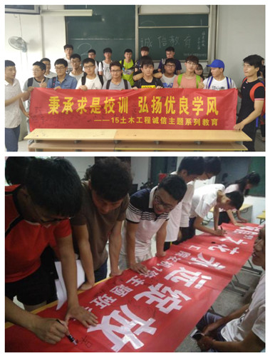 期末考试在即,学院要求各班级加强诚信考试教育,为学生党员、学生骨干等制作了诚信考试示范牌,要求在考试中要始终摆放诚信考试示范牌,为营造班级良好学习风气树立榜样。有的班级还提前制作了横幅,带领学生诚信签名,鼓励学生用行动诠释诚信之美。
