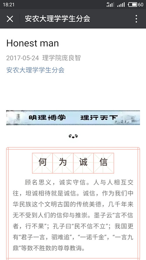诚信是中华民族的传统美德,也是社会主义核心价值观的重要内容,更是大学生立身为人、成长成才的必备品质。“车无辕而不行,人无信则不立”,历时两周多,我院积极响应号召举办的学生诚信教育主题活动圆满结束,此次活动取得的良好成效,将极大推动我院今后的学风建设和诚信教育,为培养德才兼备、全面发展的中国特色社会主义合格建设者和可靠接班人做贡献。(姚伟 通讯员:钟晨)