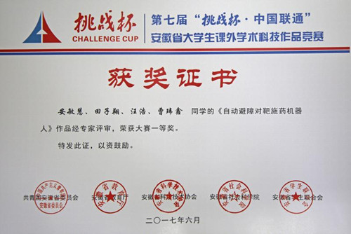 本网讯 6月3日至5日,由团省委、省教育厅、省科协、省社科院、省学联共同主办的安徽省第七届“挑战杯”大学生课外学术科技作品竞赛终审决赛在安徽理工大学举行。由工学院刘路、孙福老师指导,学院安敏慧、田子翔、汪浩、曹玮鑫等本科生提交的作品——《自动避障对靶施药机器人》,经评审答辩,荣获大赛一等奖,成功晋级国赛。