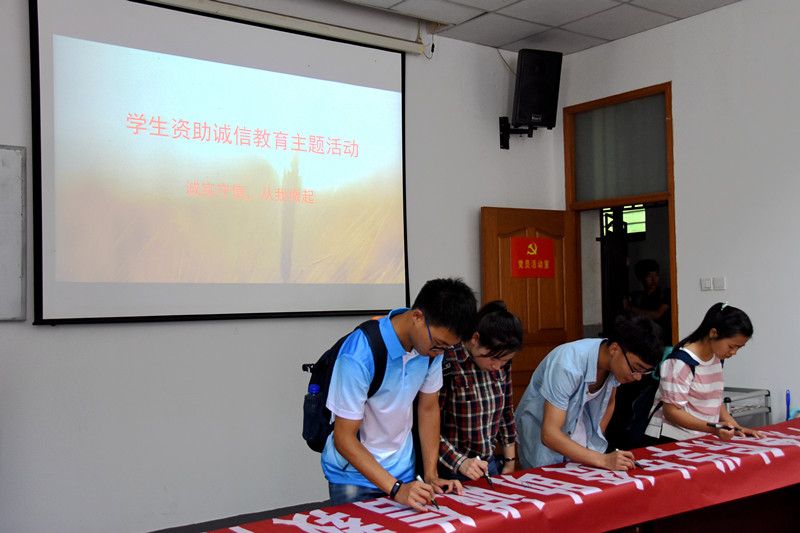 本次活动分为诚信教育讲座、学生签名和诚信宣誓三个板块,通过诚信教育讲座让学生了解活动目的,认识到“诚信不在乎事大事小,不在乎人大人小,每个人每件事都得诚信”的道理。组织在场受助生签名,增强学生诚信还贷的信心,深化了诚信在学生心中的观念。诚信宣誓,从字里行间中增强同学们的“责任还贷”意识,进一步使学生认识到诚信重要性。