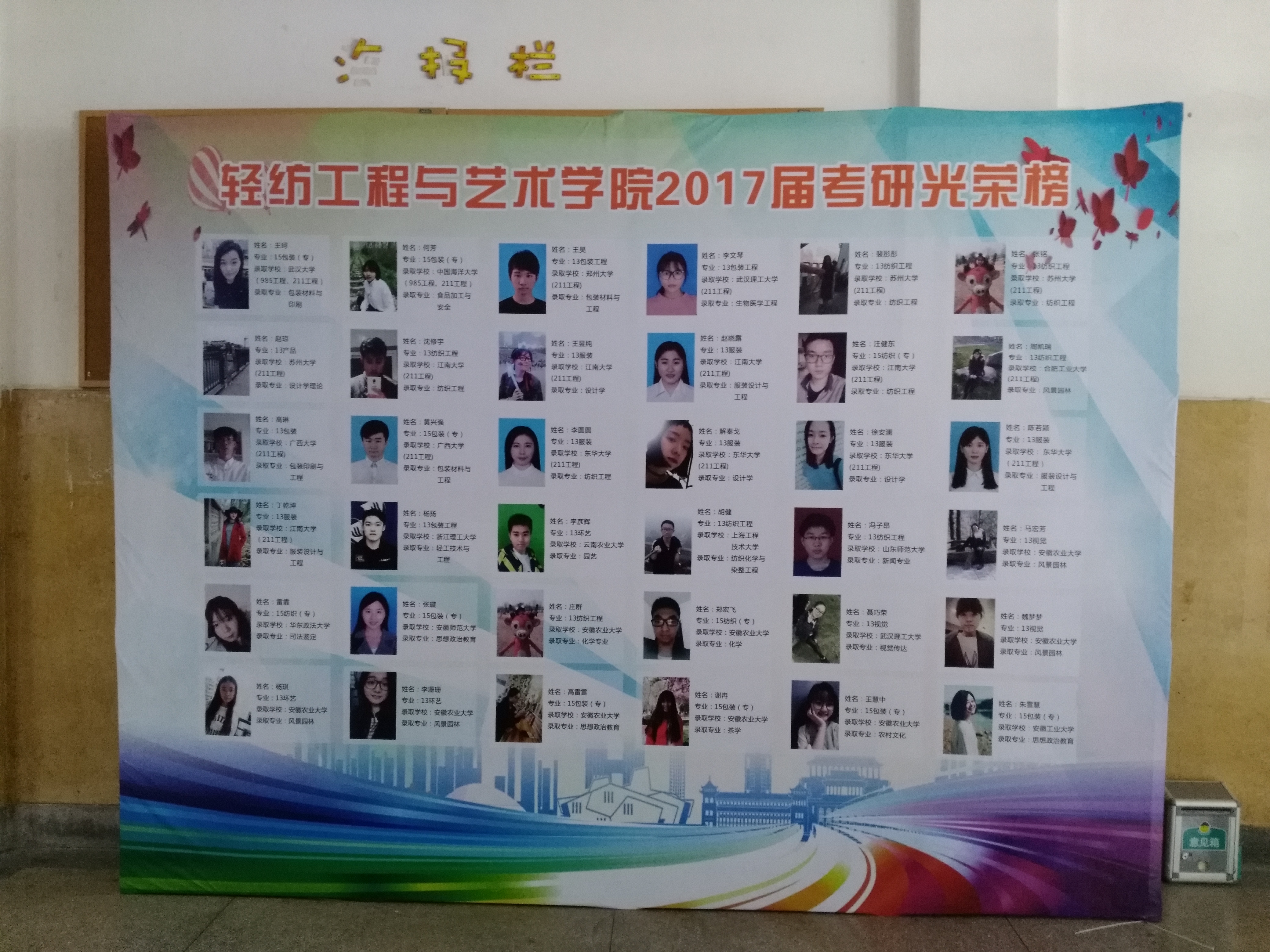 宣传榜样力量,营造考研氛围。学院2017届毕业生中考入武汉大学、中国海洋大学、东华大学、江南大学等985、211工程院校人数较往年有大幅提升。为此,学院专门制作了2017届毕业生考研光荣榜,并组织了考研经验交流会,用榜样力量带动考研氛围,切实为2018届毕业生考研提供帮助。