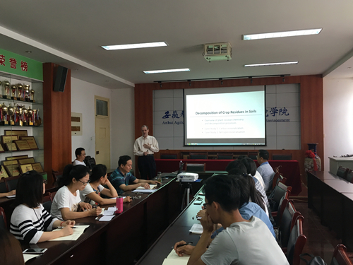 根据学院学科发展和相关教师科研需求,Michael L Thompson为学院师生做了《Decomposition of Crop Residues and SOM Chemistry》专题讲座,Thompson教授分别从《Decomposition of crop residues in soils》、《Overview of soil organic matter chemistry》、《Mechanisms of stabilization of soil organic matter》等方面系统介绍了作物秸秆在土壤中的降解途径与机理及其对土壤有机质化学结构与稳定性的影响。