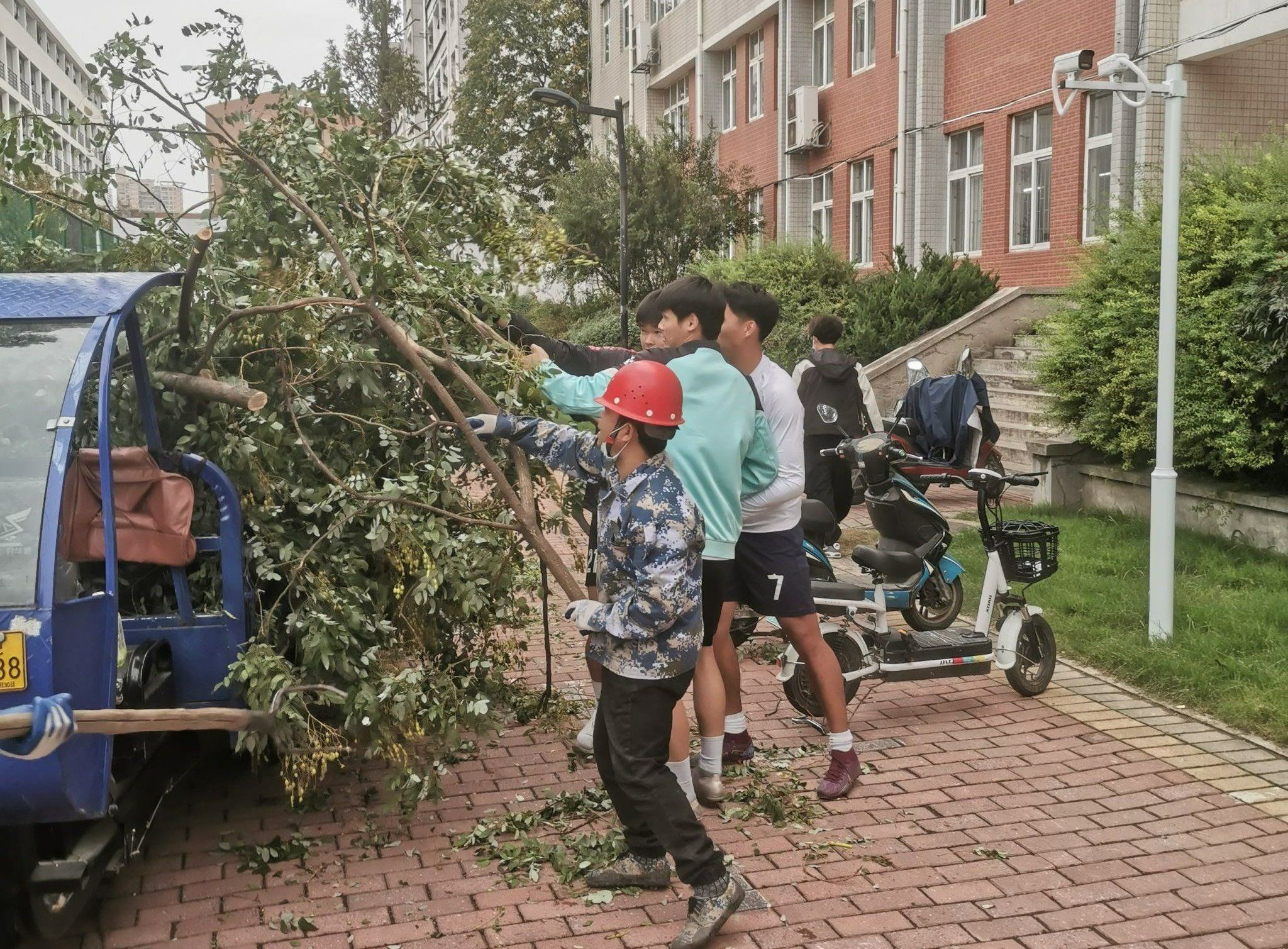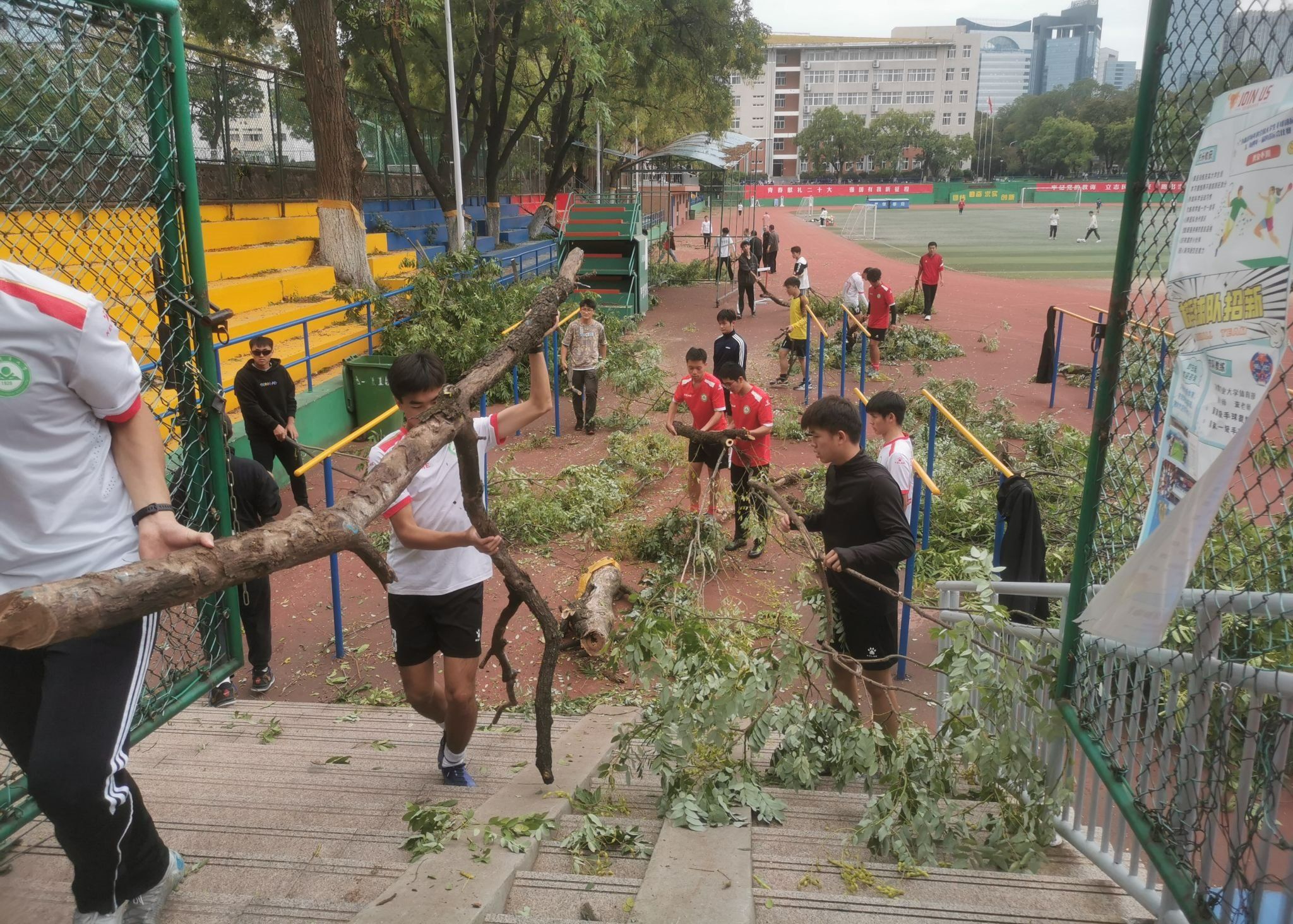 田径场周边的树木因树龄较长,树枝生长过于茂盛,部分树木高度和冠幅参差不齐,阻挡了田径场看台视野,影响了夜晚照明灯光效果,给学生体育锻炼带来一定的安全隐患。根据学校统一部署,校重点建设工作专班组织工人对树木枝叶进行了修剪,体育部紧密配合,组织师生及时清运散落的树干、枯枝,确保现场安全和田径场跑道的顺畅。经过修剪,原本过于茂密的树木变得整齐美观,田径场看台的视野变得更加开阔,同时也为师生提供了一个干净、整洁、美观、舒适的运动环境。(一审:李诚刚,二审:李宏,三审:周晓璇)