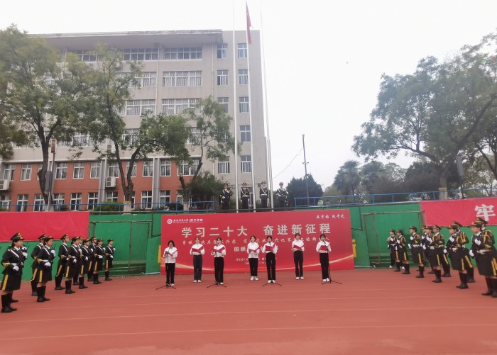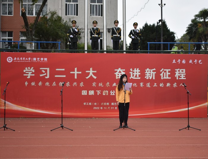 活动以“学习二十大 奋进新征程——争做奔跑在强农兴农 实现农业现代化赛道上的新农人”为主题。在全体师生的注目礼下,国旗护卫队护送国旗入场。在庄严的国歌声中,五星红旗冉冉升起,在场的每位师生满怀对祖国的崇敬敬意与无限热爱。