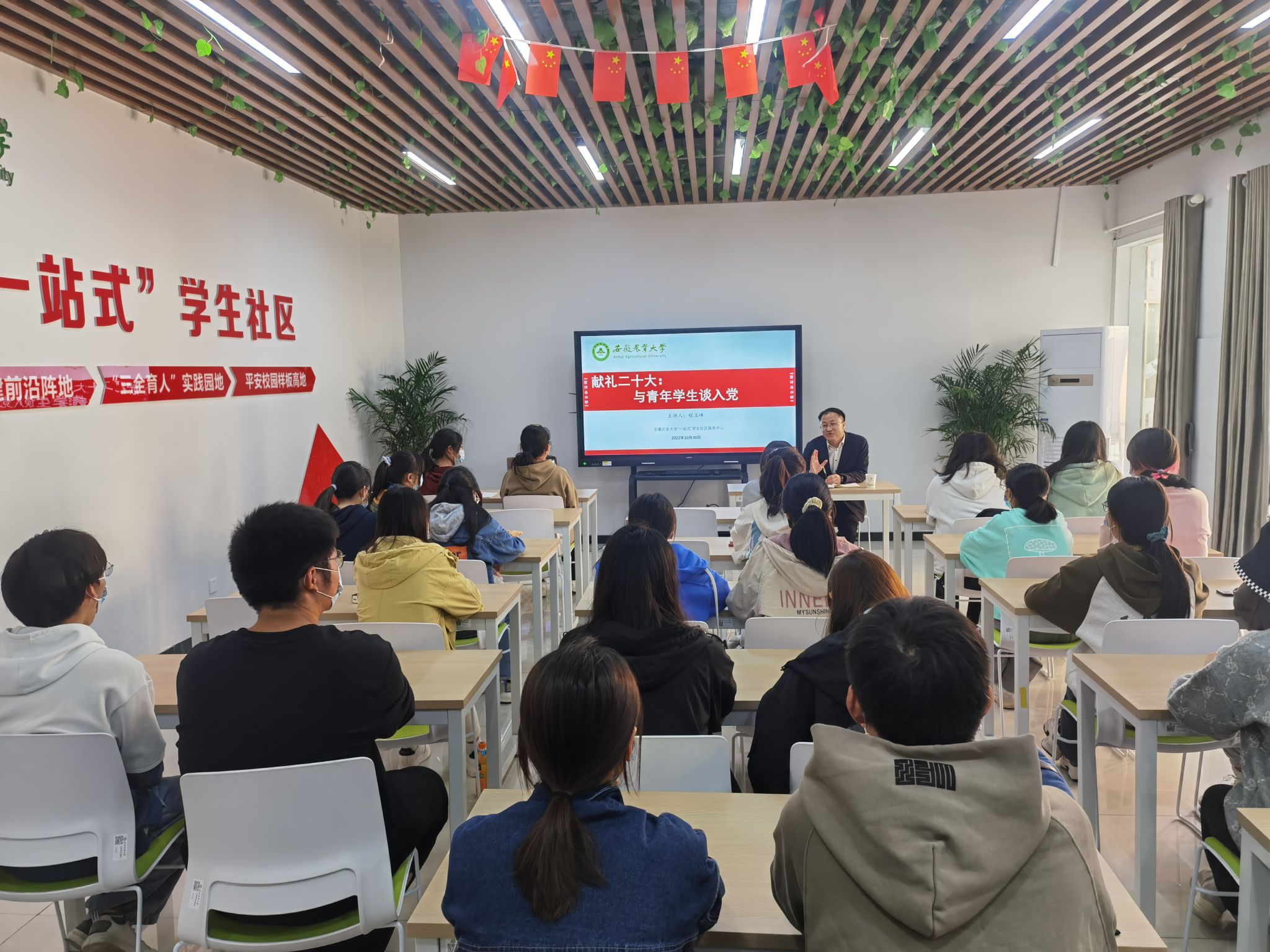 本网讯 10月30日下午,我校“一站式”学生社区兼职辅导员程玉峰在“一站式”学生社区开展了“与青年学生谈入党”主题交流讲座。