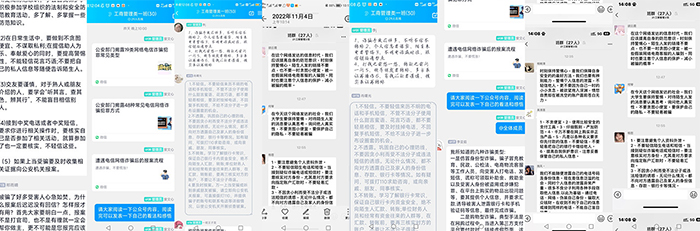 发挥安全委员作用,做好安全工作常提醒。9月,学院2022级新生辅导员抓住新生入学安全教育的“黄金期”开展反电诈安全教育;通过学生工作QQ群、微信群及时推送“反诈骗”宣传知识及典型案例;组织安全委员在班级群进行安全提醒,以此来强化学生的防范意识和防范能力。“安全无小事”,安全委员的设置是推进“平安校园”的一项举措,不仅拓宽学生参与安全管理渠道,更以点带面实现了安全管理“无缝隙”。