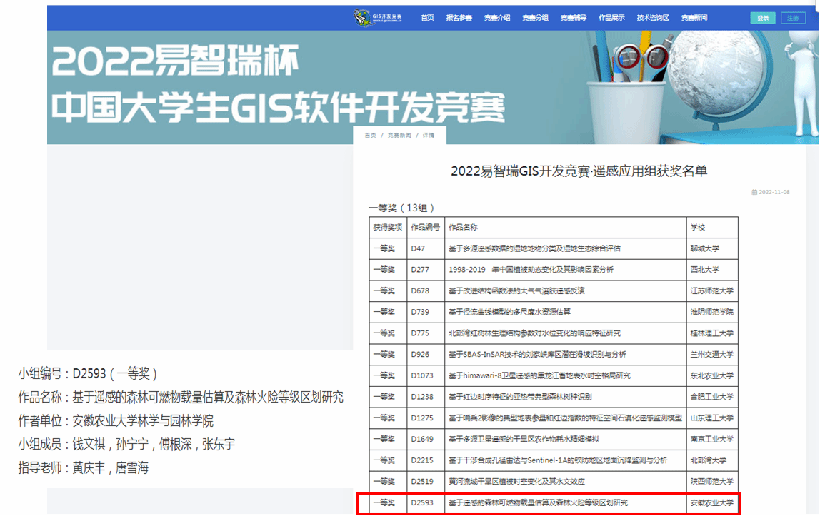 本网讯 近日,2022年易智瑞杯中国大学生GIS软件开发竞赛(简称“GIS开发竞赛”)落下帷幕。我校林学与园林学院森林经理学科在竞赛中脱颖而出,由教师黄庆丰和唐雪海指导的《基于遥感的森林可燃物载量估算及森林火险等级区划研究》获遥感应用组一等奖。