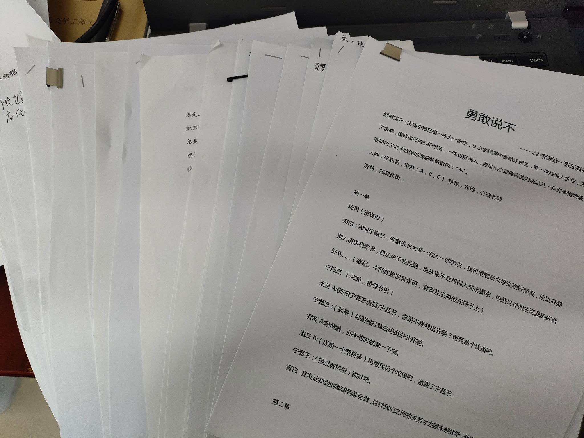 10月17日至20日,学院组织开展心理情景剧剧本征集大赛,引导学生结合实际,对生活、学习、交往中遇到的烦恼、困惑等通过撰写剧本的方式展现出来,在剧本写作中感悟剧本中人物心理的变化过程,从而达到释放压力、缓解心情的效果。同学们对剧本征集大赛充满热情,共提交原创作品33份。