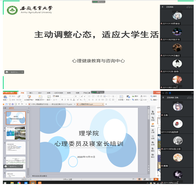 11月11日,学院采用线上讲授的方式,面向2022级全体新生开展心理适应性讲座、2022级心理委员和寝室长开展心理业务知识讲座。主讲人从中学向大学的转变入手,帮助同学们分析可能会遇到的心理困扰,引导同学们通过合理宣泄、人际调节、认知调整和目标设定等多种方法进行自我心理调整,必要时应学会寻求有效帮助,并鼓励新生做好充足的心理准备,积极应对困难与挫折,度过一个有意义的大学生活;帮助全体心理委员和寝室长详细介绍了学院三级心理网络的设置和功能,以及自身工作职责和内容,引导他们重点关注同学的心理健康状况,发现异常及时与辅导员老师沟通联系,共同守护班级同学的心理健康。