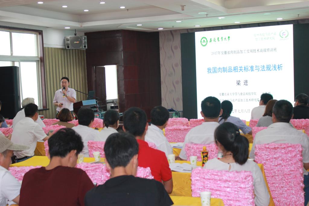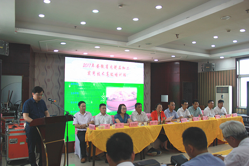 本网讯 7月7-8日,由安徽农业大学茶与食品科技学院联合宿州市宿马农产品加工技术研究院共同主办的“2017年安徽省肉制品加工实用技术高级培训班”顺利开班。安徽省外国专家局解正茂处长、周平副处长、茶与食品科技学院党委书记崔云、宿马现代产业园区管委会副主任郭军出席开班仪式。安徽至诚和信食品科技有限公司和宿州市符离集刘老二烧鸡有限公司共同承办此次活动,公司主要负责人、授课教师以及来自全省100多名学员参加了开班仪式。仪式由茶与食品科技学院副教授熊国远主持。