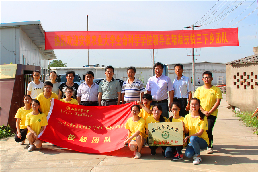 本网讯 按照校团委关于暑期“三下乡”社会实践活动的统一部署要求,生命科学学院赴长丰县吴山镇暑期“三下乡”社会实践团于7月10日开启了为期一周的征程,团队紧紧围绕“喜迎十九大,青春建功新农村”这一主题,以“青春助力精准扶贫,协力共建美好乡村”为中心,积极展开了各项社会实践活动。7月14日,学院党委书记朱绍友、副院长江海洋、团队指导老师李纯以及院办公室人员前往长丰县吴山镇合肥益康现代农业科技开发有限公司看望慰问了正在实践的团队成员,并为安徽农业大学社会实践基地挂牌。吴山镇党委书记杜和洲、副镇长方波、合肥益康现代农业科技开发有限公司总经理邓光政出席了座谈会和挂牌仪式。