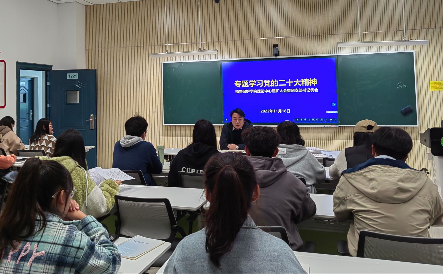 本网讯 11月18日,植物保护学院团委在中西部综合楼1221室举办理论学习中心组扩大学习会暨团支部书记例会,专题学习党的二十大精神。学院党委副书记汪小强、院团委委员、团支部书记参加了会议。会议由院团委负责老师主持。