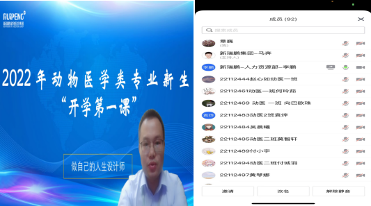 本网讯 11月17日晚,动物科技学院邀请新瑞鹏宠物医疗集团招聘副总监李鹏开展主题为“遇见宠物医疗行业 预见美好未来”的线上讲座。学院党委副书记章巍、动物医学系主任和2022级动物医学全体新生参加了会议。