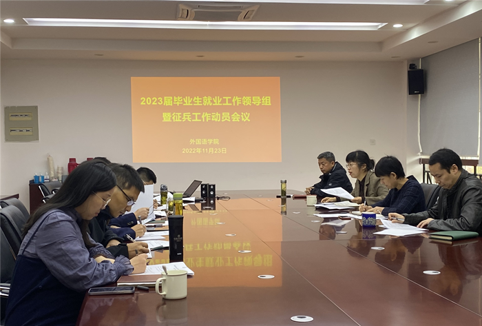 本网讯 11月23日上午,外国语学院2023届毕业生就业工作领导组暨征兵工作动员会在外语楼506会议室召开,院长姜红、副院长王玉明、许宗瑞、各系部主任、毕业班辅导员、就业联络员等参加了会议。会议由党委副书记、纪委书记、副院长姬惠惠主持。