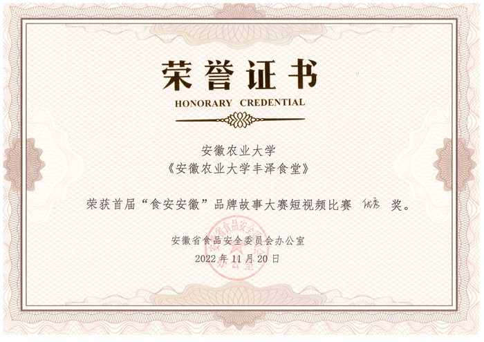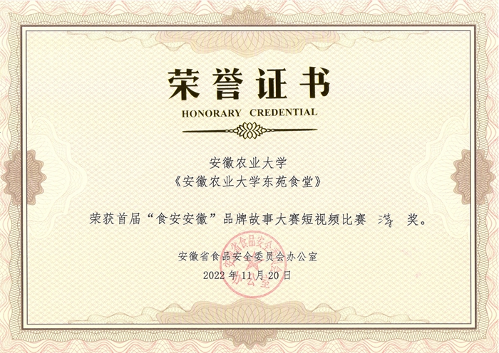 本网讯 11月19日至20日,由安徽省食品安全委员会办公室举办的首届“食安安徽”品牌故事大赛在安庆市举行,后勤保障处精心组织,积极参赛。我校报送的作品《安徽农业大学东苑食堂》《安徽农业大学丰泽食堂》短视频获得表彰,我校作为作品的申报方获得短视频比赛的三等奖和优秀奖。