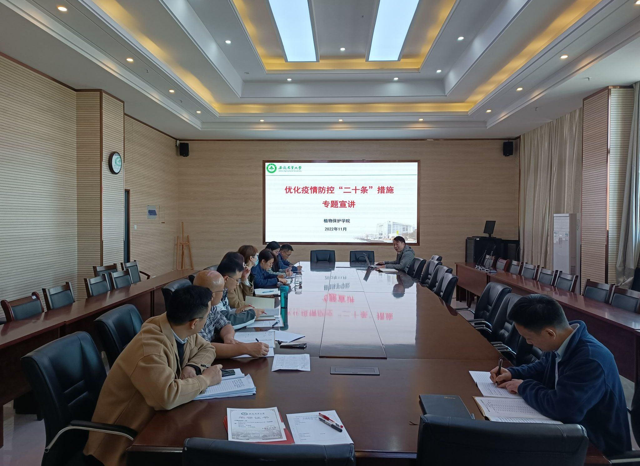 本网讯 11月25日上午,植物保护学院在中西部综合楼1211会议室召开学生疫情防控工作会议,学习传达学校疫情防控工作等会议精神,开展优化疫情防控“二十条”措施专题培训。学院全体专兼职辅导员参加会议。
