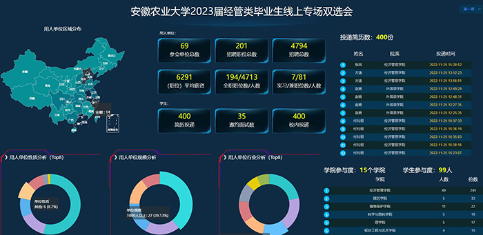 此次双选会共有69家企业参会,提供就业岗位201个,招聘人数4794人。涉及到银行、房地产、教育、农牧、建筑、生物科技、工程、通信、医疗等多个行业。截止11月25日,招聘会总浏览量24071次,毕业生通过平台投递简历400份,用人单位查看简历304份。