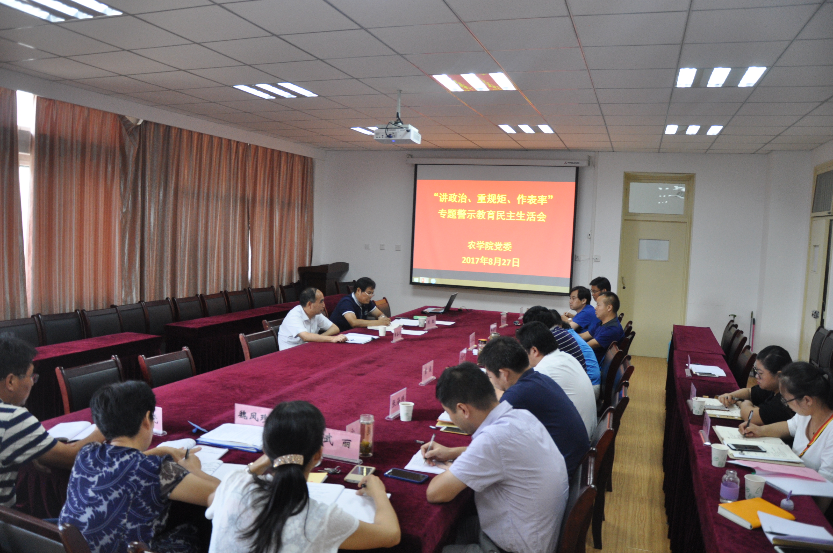 本网讯 为深入推进“讲政治、重规矩、作表率”专题警示教育扎实开展,8月27日下午,农学院党委在十教518室召开领导班子“讲重作”警示教育专题民主生活会,会议由党委书记汪凤莲主持,农学院领导班子、党委委员、各支部书记出席会议,校长程备久、校办公室主任刘凯到会指导。