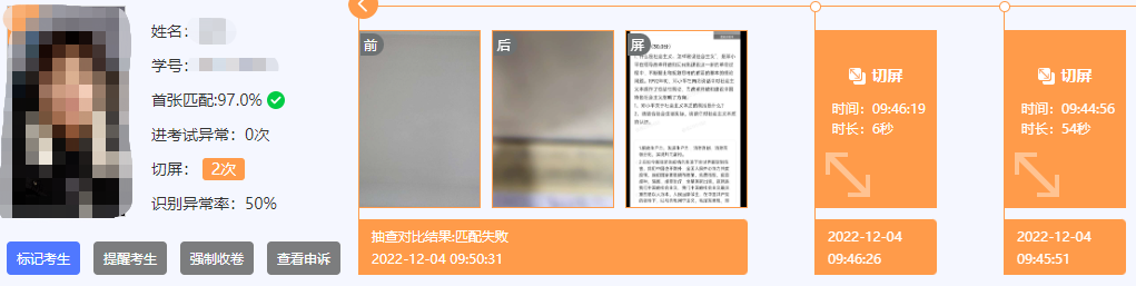 由于线上考试的特殊性,为保证结果合理公正,学生统一在教室按照固定座位答题。考试过程中系统设置的抓拍、切屏监控、及时提醒等措施,使考生们不能过多切换考试界面,也不允许复制粘贴,任课教师和监考教师则可以随时跟踪学生的答题进度和答题状态,很好地防范了舞弊行为的发生。