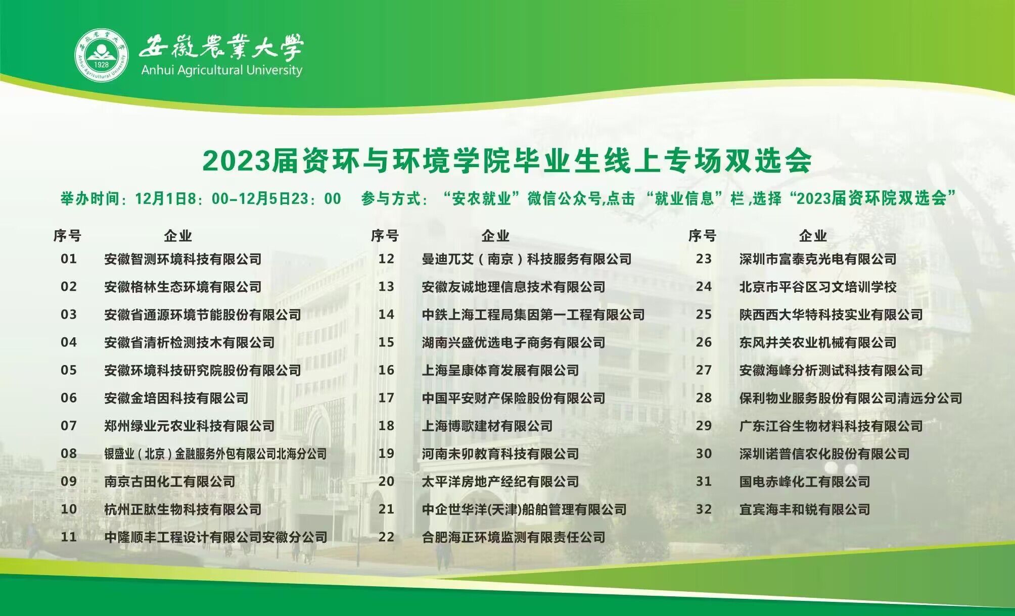 本网讯 为帮助2023届毕业生顺利就业,搭建毕业生和用人单位双向就业服务平台,促进毕业生实现更充分更高质量就业,12月1日至5日,资源与环境学院举办了2023届毕业生空中双选会。