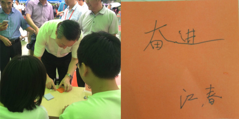 9月2日上午十点,学校党政领导视察学院迎新工作,学校党委书记书记江春为新生写下美好祝福和期许“奋进”,勉励农学学子做新时期新农人,在实现中国梦的伟大进程中贡献青春,用实际行动做“六有”大学生,做习大大要求的新青年。