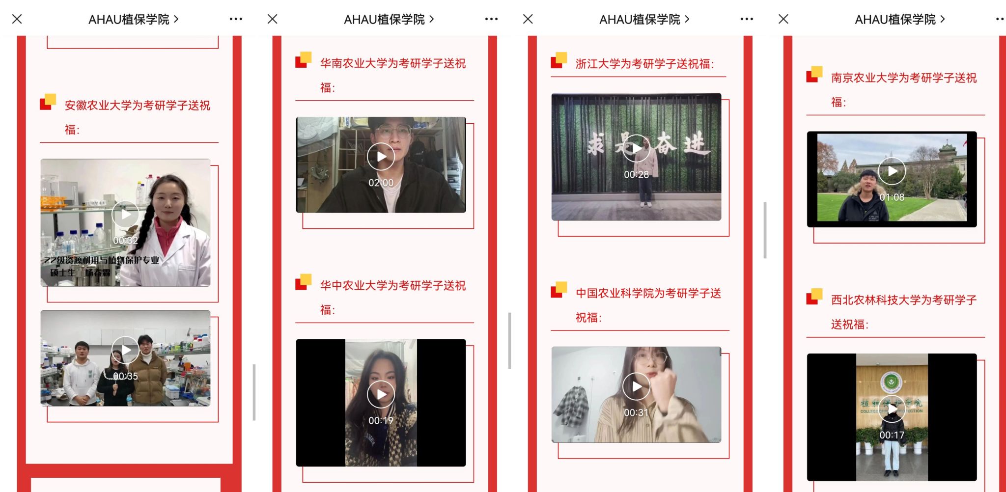 学长学姐送祝福。来自中国农业科学院、浙江大学、南京农业大学、西北农林科技大学、华中农业大学等毕业生校友通过录制视频的方式,鼓励大家坚定信念,把握节奏,成功圆梦自己的理想学校。