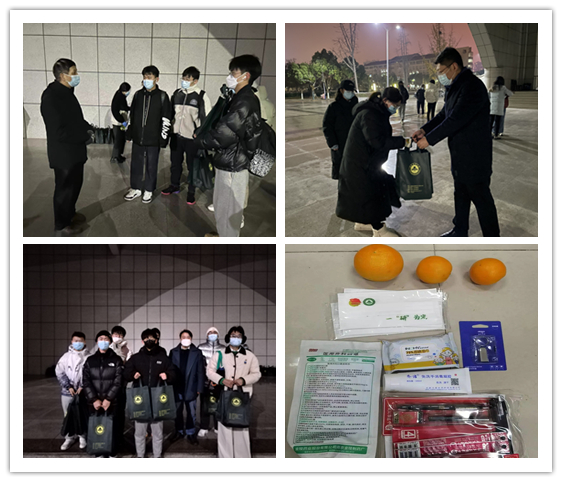领导老师送祝福。寒冷的夜晚,学院党政领导班子、毕业班辅导员冒着风雪,在图书馆西侧广场等候着结束了一天复习的同学们。亲手为大家送上笔袋、定制U盘、消毒凝胶、酒精湿巾、口罩、橙子等考研大礼包,并叮嘱同学们注意自我保护,放平心态、从容应考,力争为过去一段时间的辛勤付出画上圆满句号。