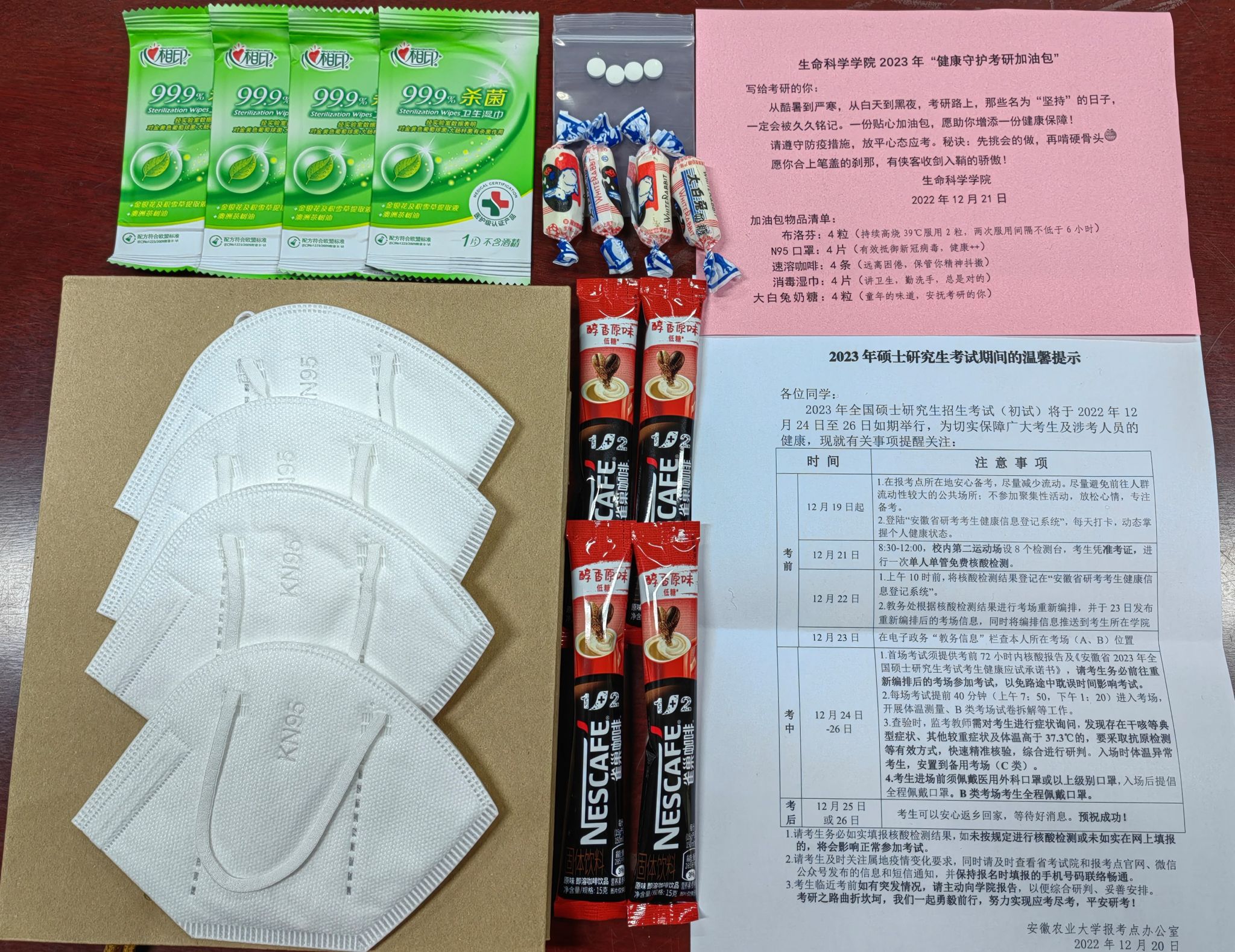 生科院“健康守护考研加油包”包含4片布洛芬,确保考研同学手中有药心中不慌,4颗大白兔奶糖、4张杀菌湿巾,4包速溶咖啡,寓意“事事如意、成功加倍”。随包还放置了学校为全体考研同学购置的4片N95口罩和考研温馨提示,以及学院给全体考研人的加油信:“从酷暑到严寒,从白天到黑夜,考研路上,那些名为‘坚持’的日子,一定会被久久铭记。一份贴心加油包,愿助你增添一份健康保障!请遵守防疫措施,放平心态应考。愿你合上笔盖的刹那,有侠客收剑入鞘的骄傲!”