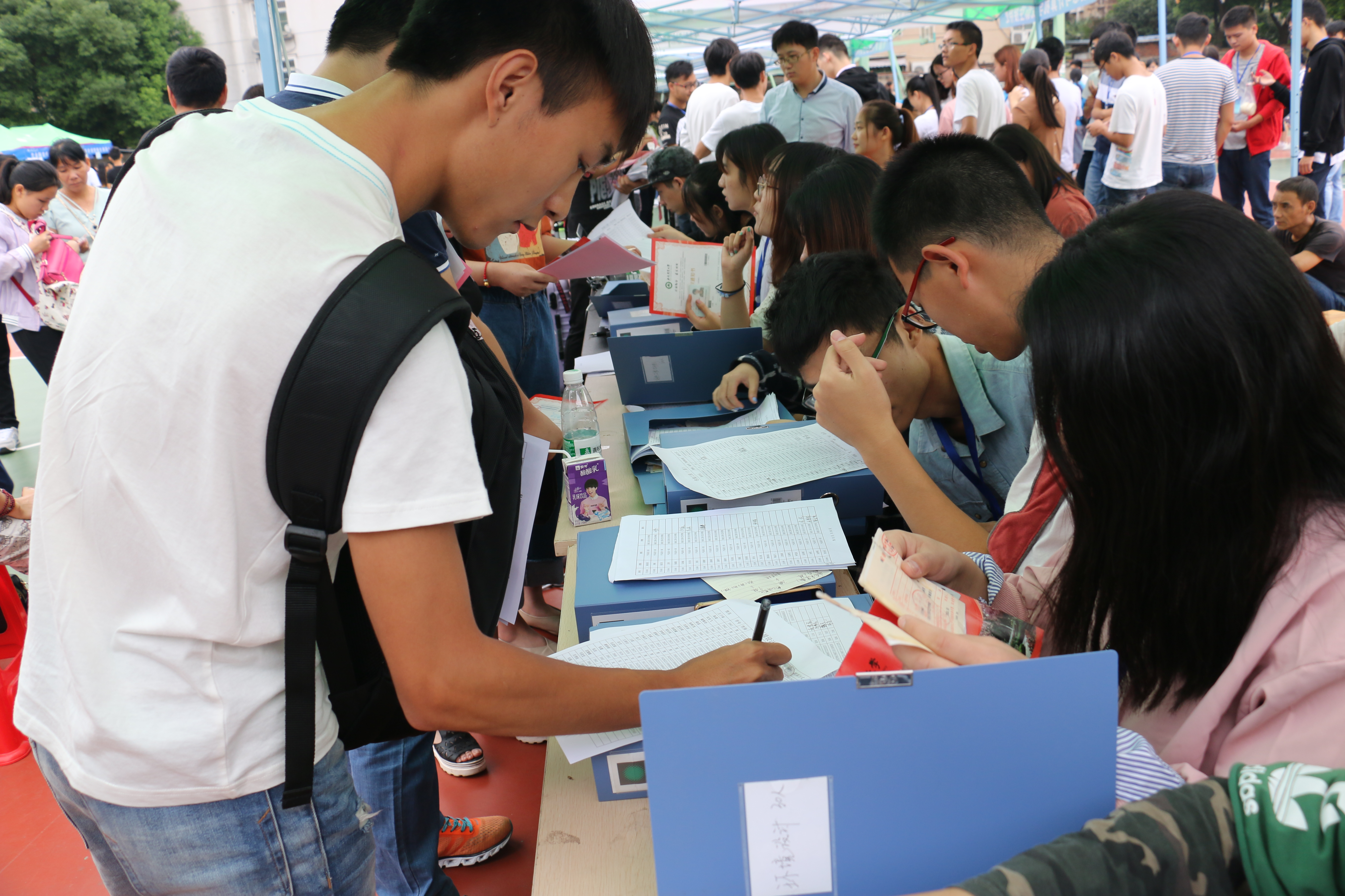 9月2日清晨,学院的迎新现场出现一支特殊的志愿者服务队伍,他们佩戴党徽、团徽,始终牢记自己是一名党员、团员,是迎新队伍中的表率和先锋,尽心尽力地为新生服务。他们按照迎新流程引导新生依次进行身份验证、缴费、发放一卡通、领取生活用品,最后带领新生入住宿舍。他们认清自己所肩负的使命和责任,表现出良好的精神风貌。