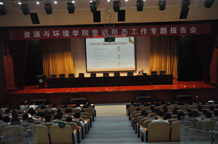 本网讯 为进一步加强和改进大学生思想政治教育工作,9月8日晚上,资源与环境学院特邀人文社会科学学院院长方章东教授,为学院辅导员、学生党员、2017级本科生、2017级研究生等400余人作意识形态工作专题报告。学院党政领导出席报告会。