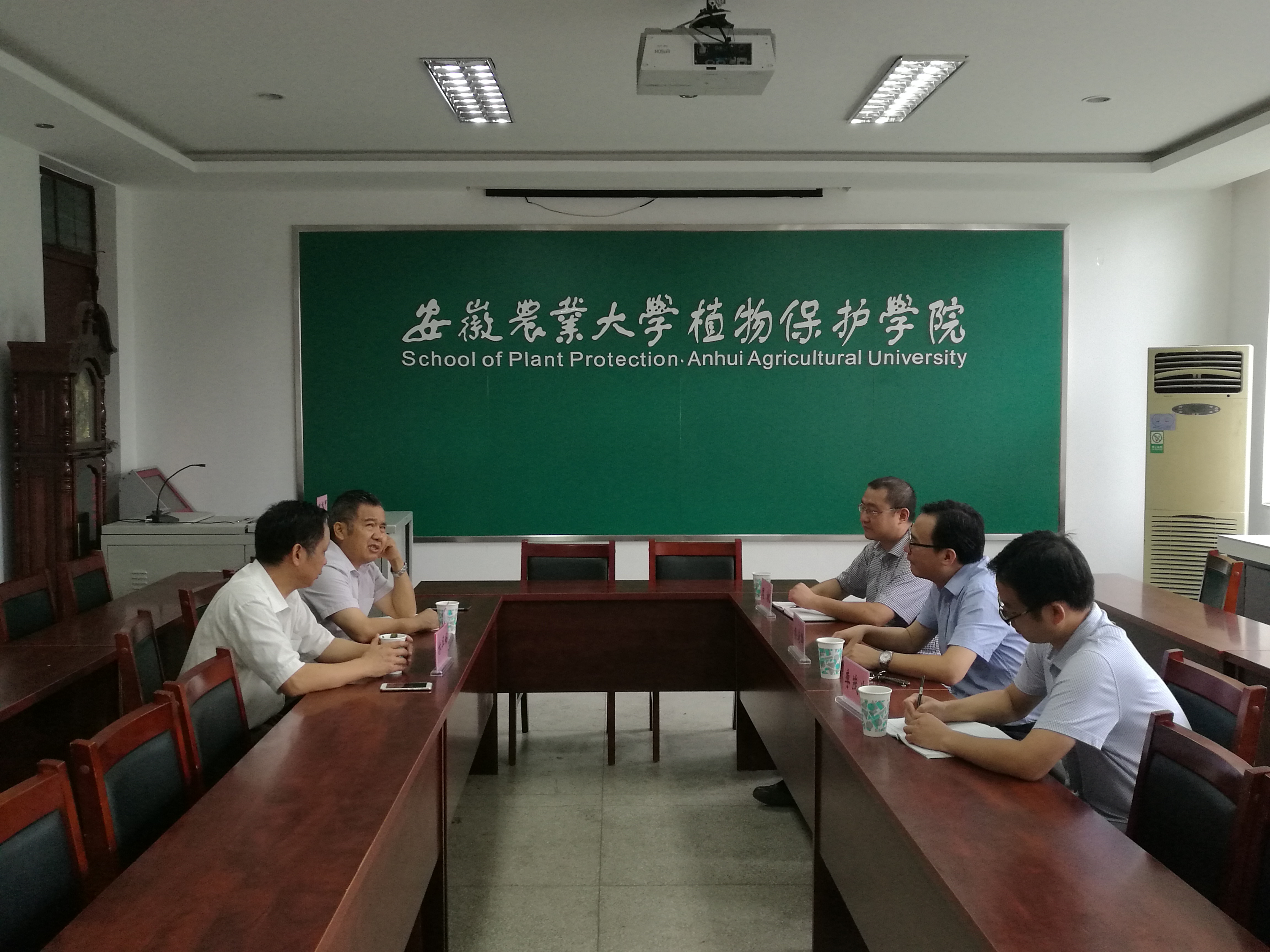 本网讯:9月10日,安徽江淮园艺科技有限公司董事长戴祖云一行来到植物保护学院洽谈合作,学院院长操海群以及林华峰教授等参加了洽谈会。会议由副院长周权主持。
