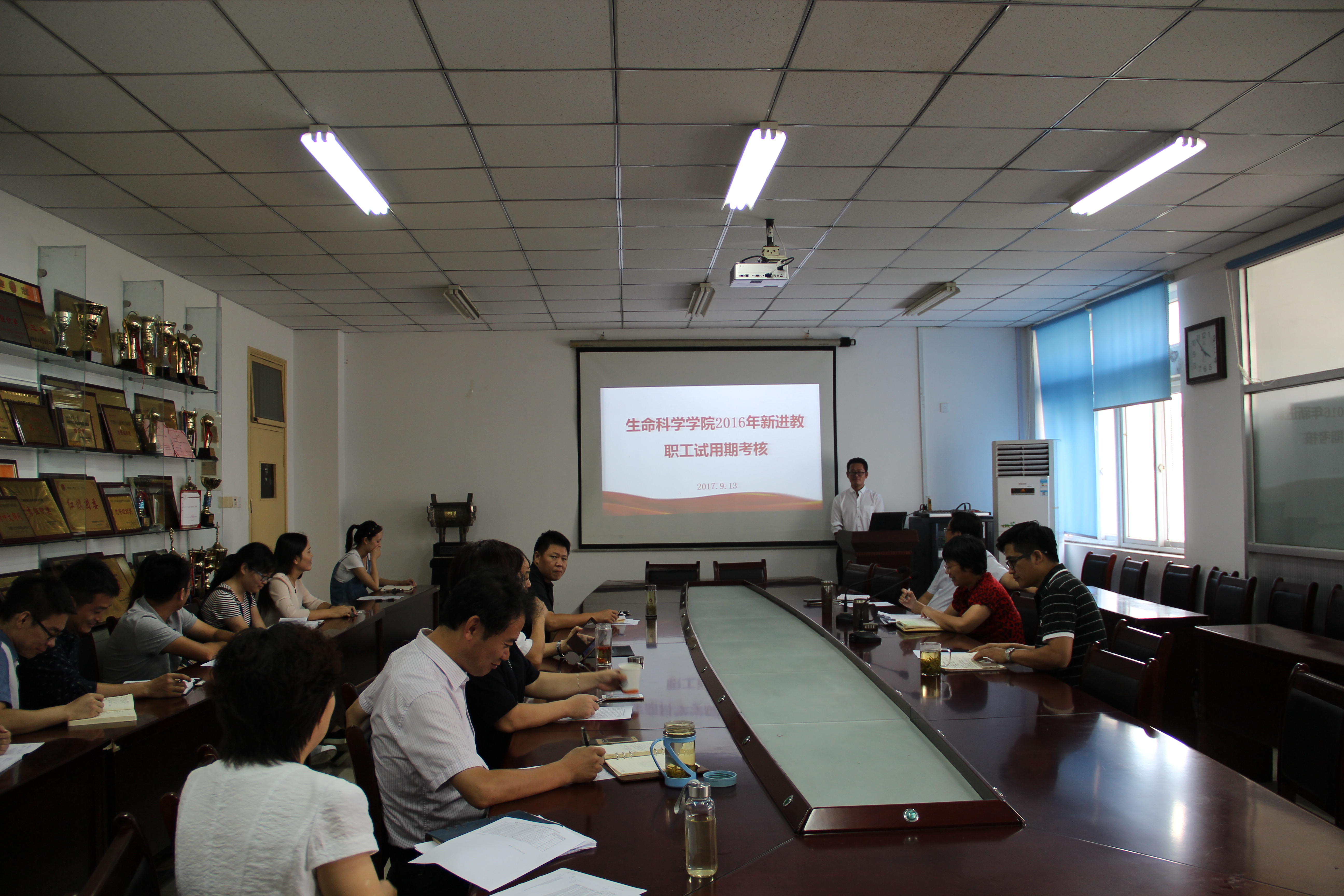 本网讯:为强化新进教职工岗位意识,提升工作能力,按照学校相关工作部署。9月13日下午,生命科学学院开展了2016年新进人员试用期考核工作,学院党政领导、系主任、院党委纪检委员、部分学术委员会委员参加了会议。会议由常务副院长蔡永萍主持。