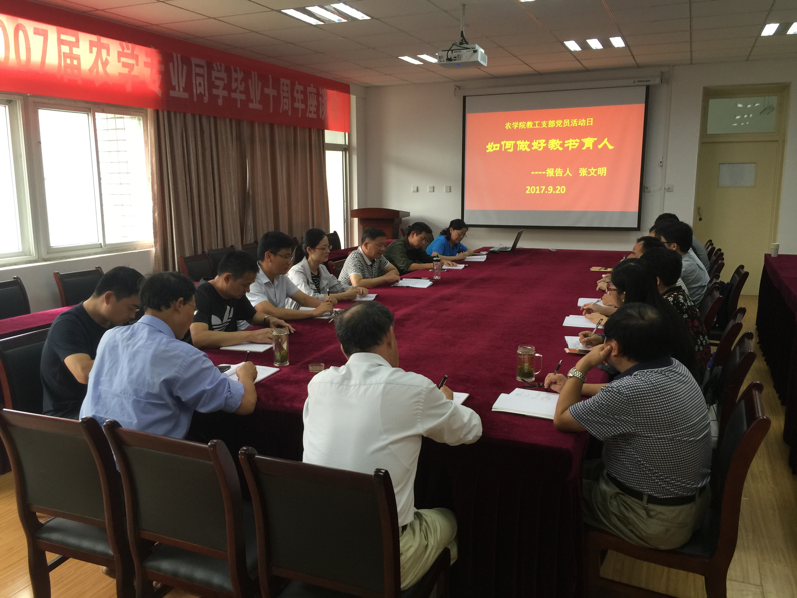 本网讯 9月20日下午,农学院教工支部在十教518开展了“党员活动日”专题活动,本次活动邀请我院张文明副教授做“如何做好教书育人”专题讲座,张文明老师是我校首批教学突出贡献奖获得者,活动由党委书记汪凤莲主持,教工第一、二、三支部的全体党员参加本次活动。