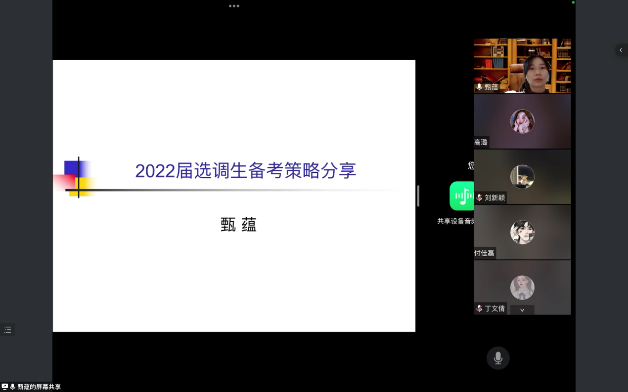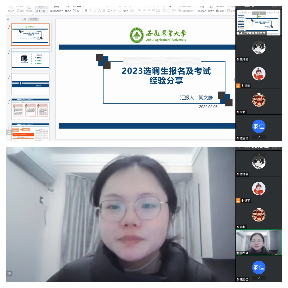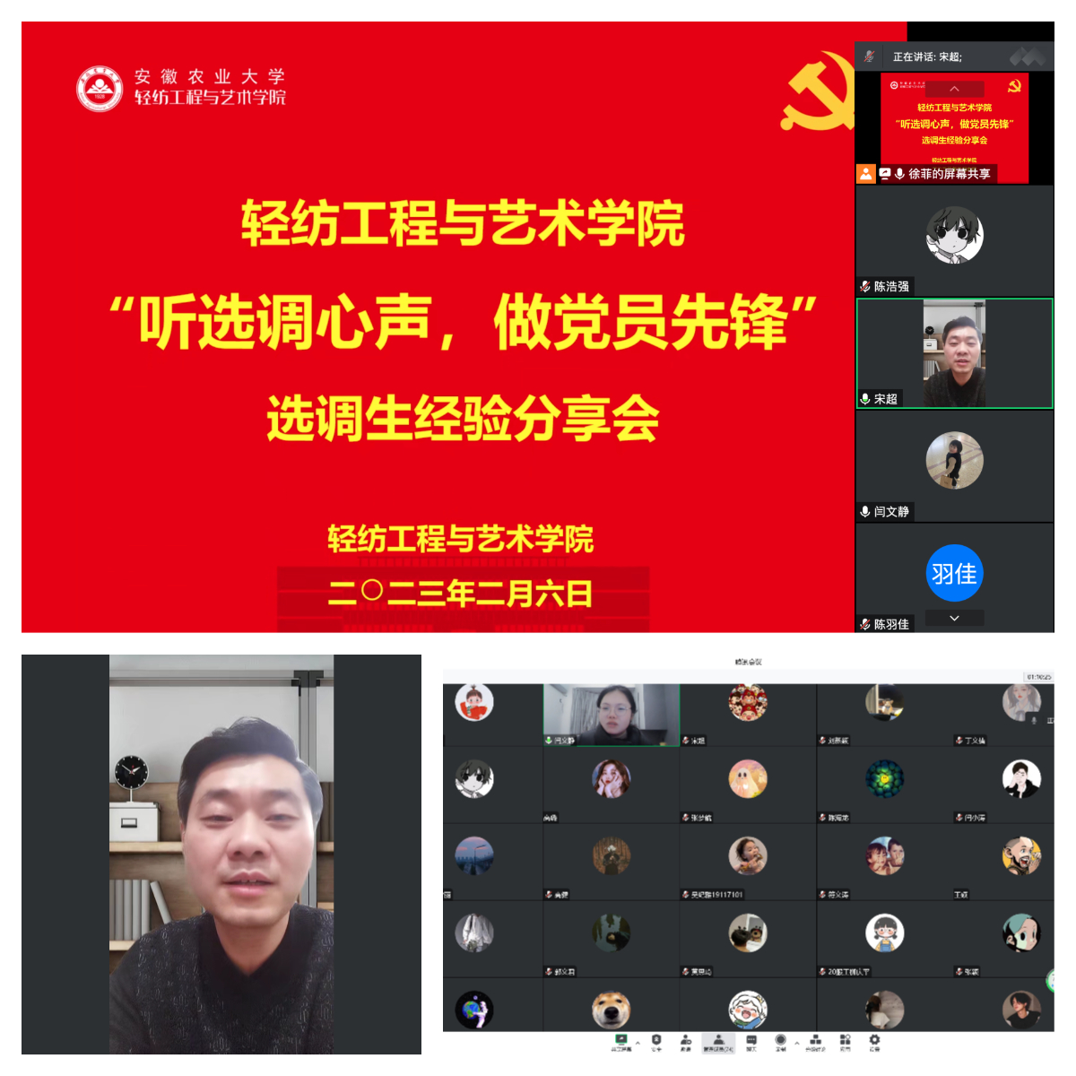 本网讯 为进一步加强同学对选调生政策的了解,鼓励同学们坚定理想信念、扎根基层、奉献祖国,2月6日晚,轻纺工程与艺术学院开展线上选调生经验交流分享会,邀请考取安徽省选调生的学院2022届校友闫文静、甄蕴就选调生政策解读、报考流程、备考策略、实际工作等方面进行分享。学院党委副书记、纪委书记、副院长宋超出席会议,学生党支部书记、学生党员共计80余人参加会议。