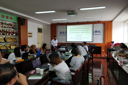 本网讯 9月23-24日,生态学专业邀请中国科学院植物研究所国家标本资源共享平台专家张明罡博士、范雪女士来校指导工作。张明罡从数据分析、模型构建、软件制图、论文框架等方面给予在该平台开展专业综合大实习同学悉心辅导。期间,张明罡博士为生态学专业全体教师和研究生做了关于《利用地标化标本构建物种分布模型及木本植物保护优先区规划》的学术报告,在数据分析、数据使用、R语言、Marxan软件、物种分布范围与预测等方面与参会师生进行了交流。