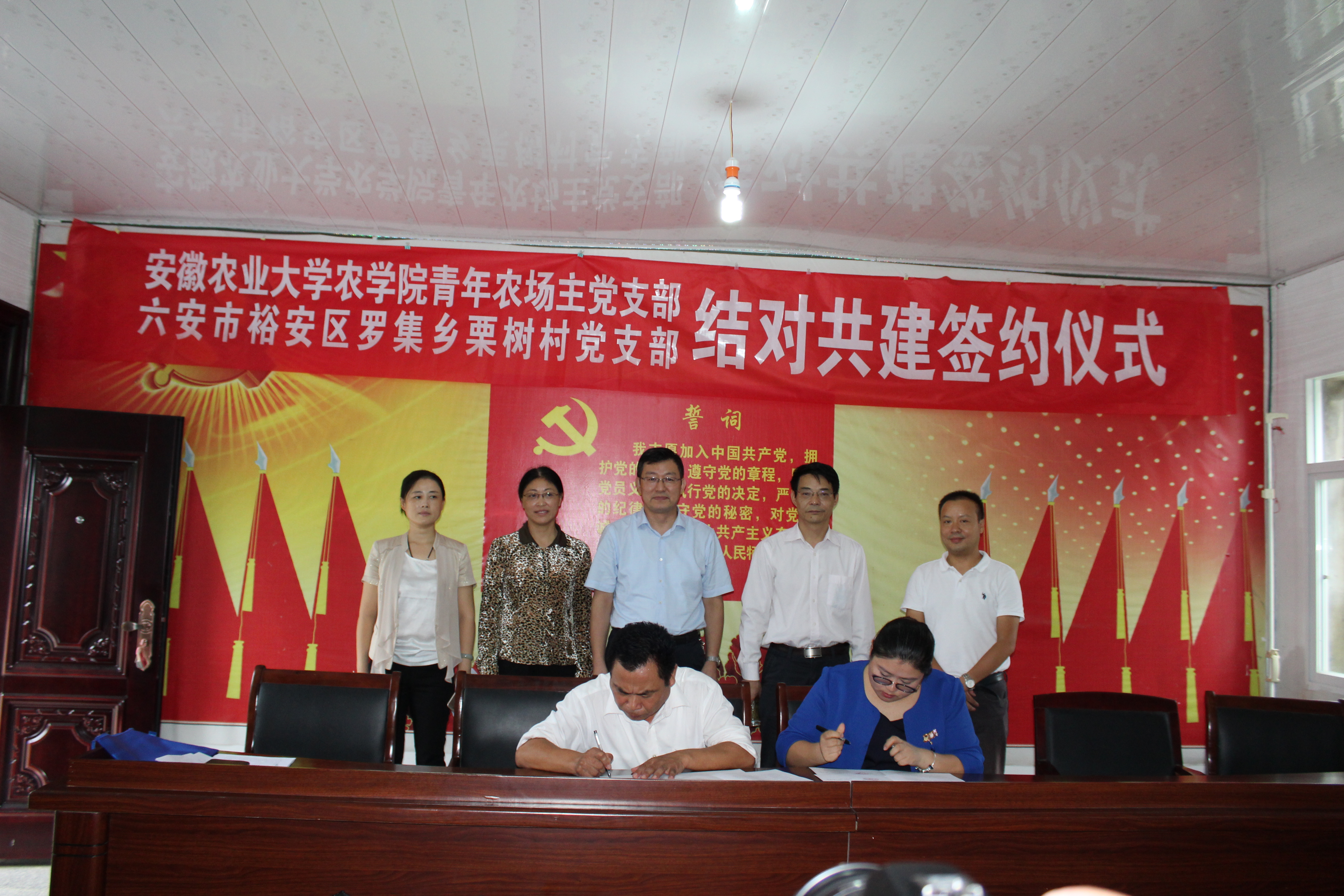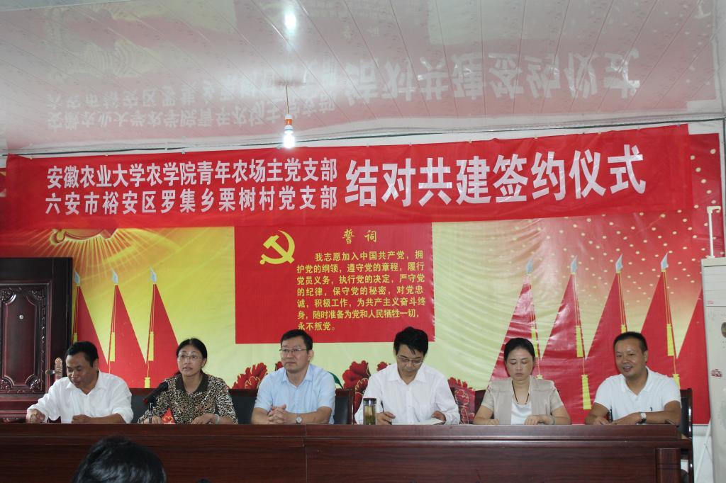 本网讯 9月26日下午,我校青年农场主党支部与六安市裕安区罗集乡栗树村党支部“基层党支部结对共建”签约仪式在栗树村村部举行。安徽调查总队党组成员、副总队长邓德平、我校党委常委、组织部部长周旭参加签约仪式并讲话。生命科学学院常务副院长蔡永萍教授、农学院党委副书记、副院长鄢高翔、青年农场主党支部书记李婧,安徽调查总队副巡视员钱千红、机关党委专职副书记许善军,裕安区罗集乡乡长鲁冬梅、栗树村党支部书记郑发青以及村全体党员参加签约仪式。签约仪式由安徽调查总队驻村扶贫第一书记吴艳主持。