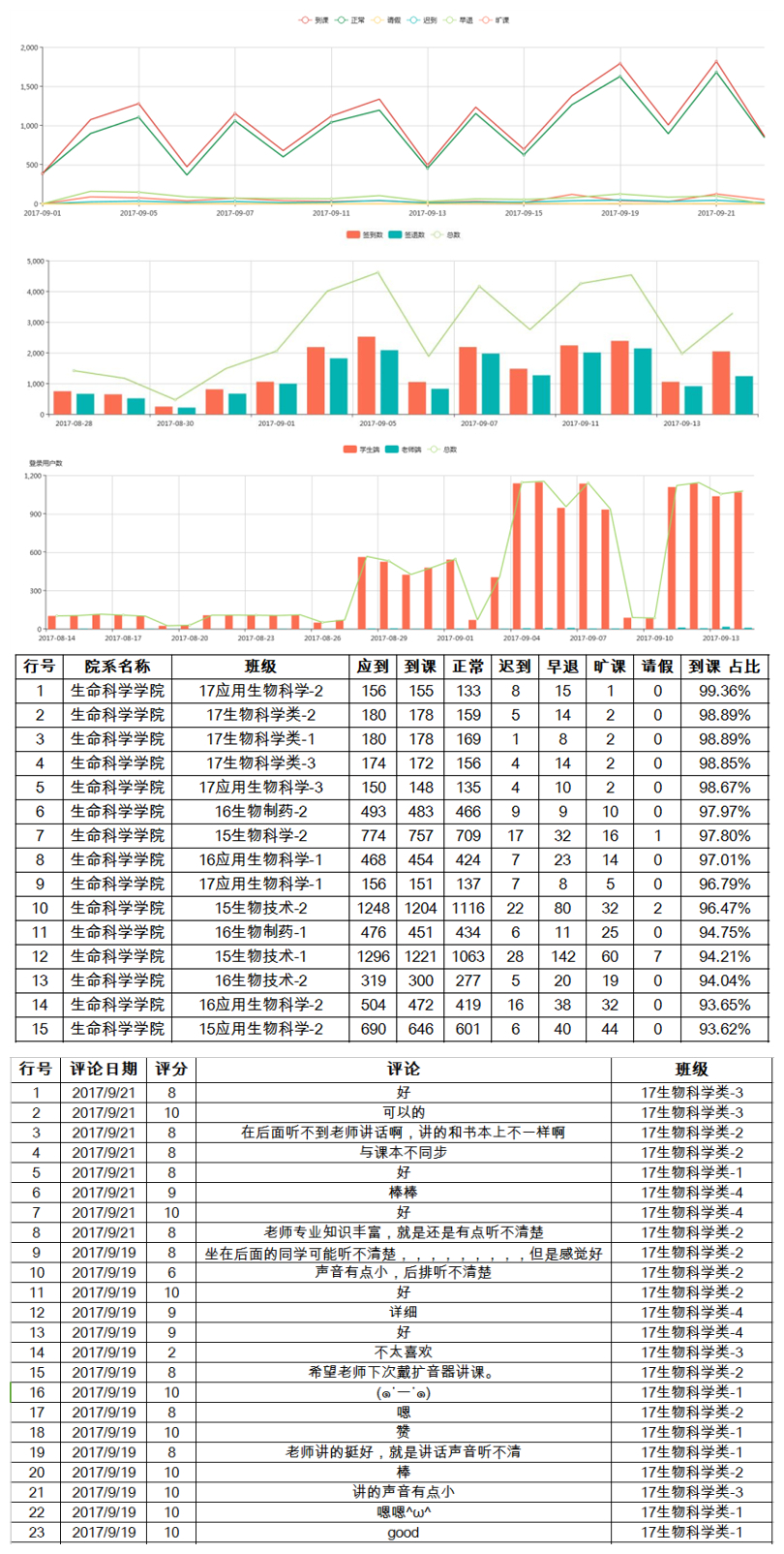 将学生课堂表现通过数据统计多维度呈现,既能够有针对性的加强学生教育管理,又能及时反馈出不同班级班风、学风建设状况。通过学生每堂课课前对相应课程授课老师的匿名评教,可以更有力、更直接地帮助任课老师进行教学改进,加强教风建设。学院定期对考勤、评教数据信息进行分析、总结、反馈,及时解决学生遇到的实际问题,提醒教师关注学生课堂动态,做到互教互学、教学相长。