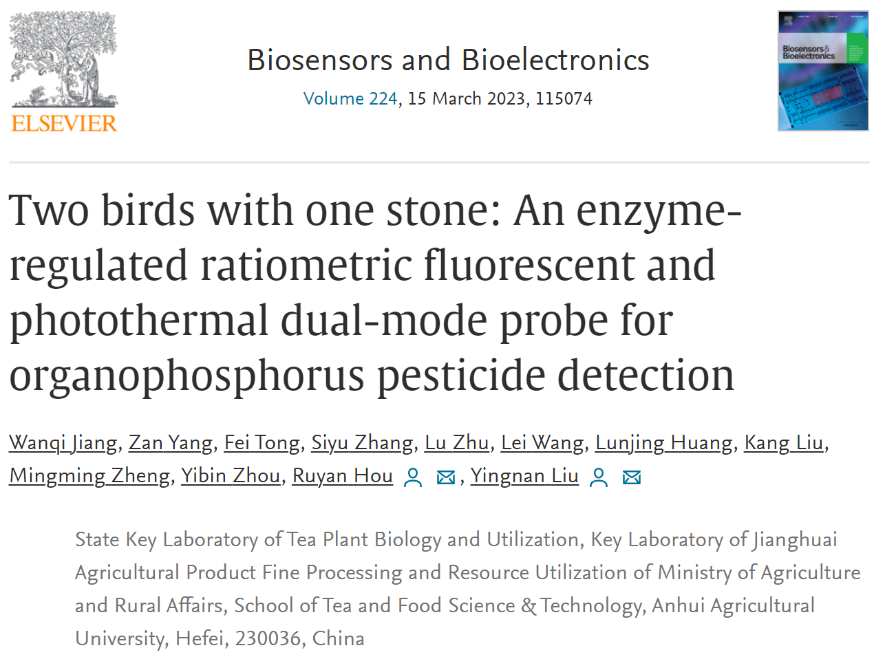 本网讯 近日,国际著名学术期刊《Biosensors and Bioelectronics》(IF=12.545,中科院一区)发表了我校茶与食品科技学院食品安全快速检测创新实验室的最新研究成果“Two birds with one stone: An enzyme-regulated ratiometric fluorescent and photothermal dual-mode probe for organophosphorus pesticide detection”。该研究聚焦食品中有机磷农药(OPs)的残留检测——这一备受关注的食品安全问题,突破了现有茶叶及糙米中的荧光分析法响应信号单一、结果易受环境因素干扰等制约OPs荧光快检技术发展的主要瓶颈,并取得重要进展。