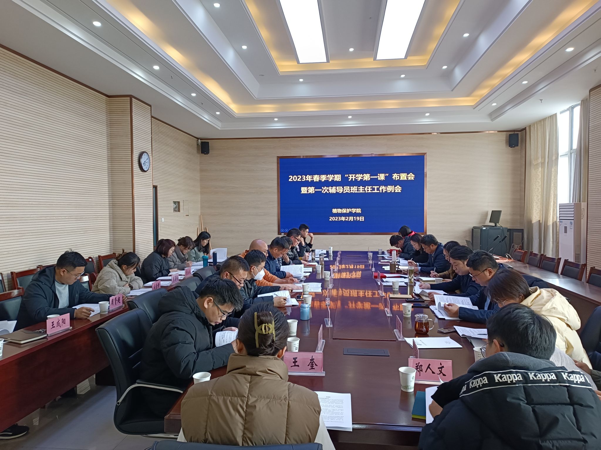 本网讯 2月19日下午,植物保护学院在中西部综合楼1213会议室召开2023年春季学期“开学第一课”布置会暨第一次辅导员班主任工作例会。院党委书记刘柳、常务副院长潘月敏、副院长唐庆峰、张华建出席会议,全体专兼职辅导员、2020级和2021级班主任参加会议。会议由学院党委副书记、纪委书记、副院长汪小强主持。