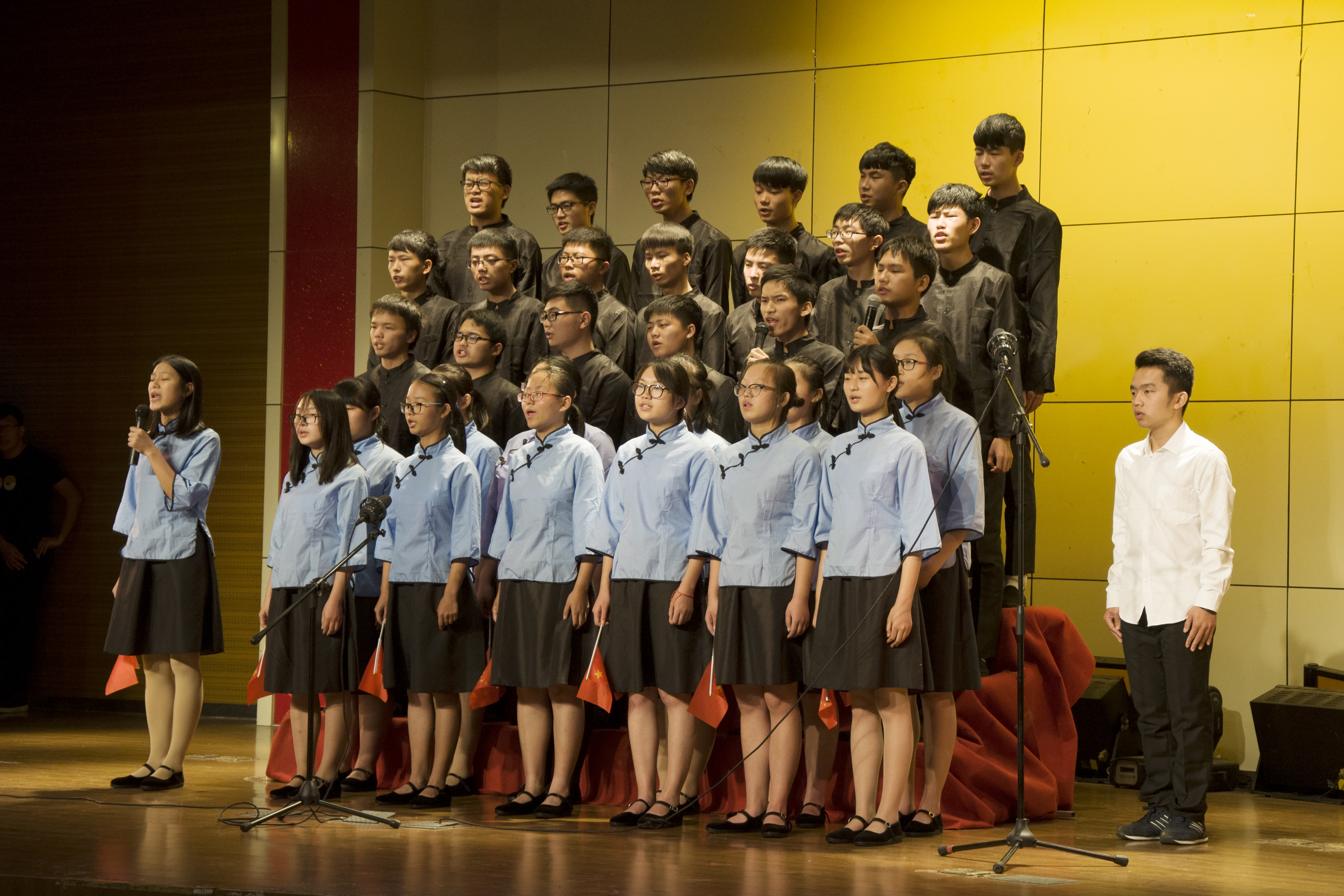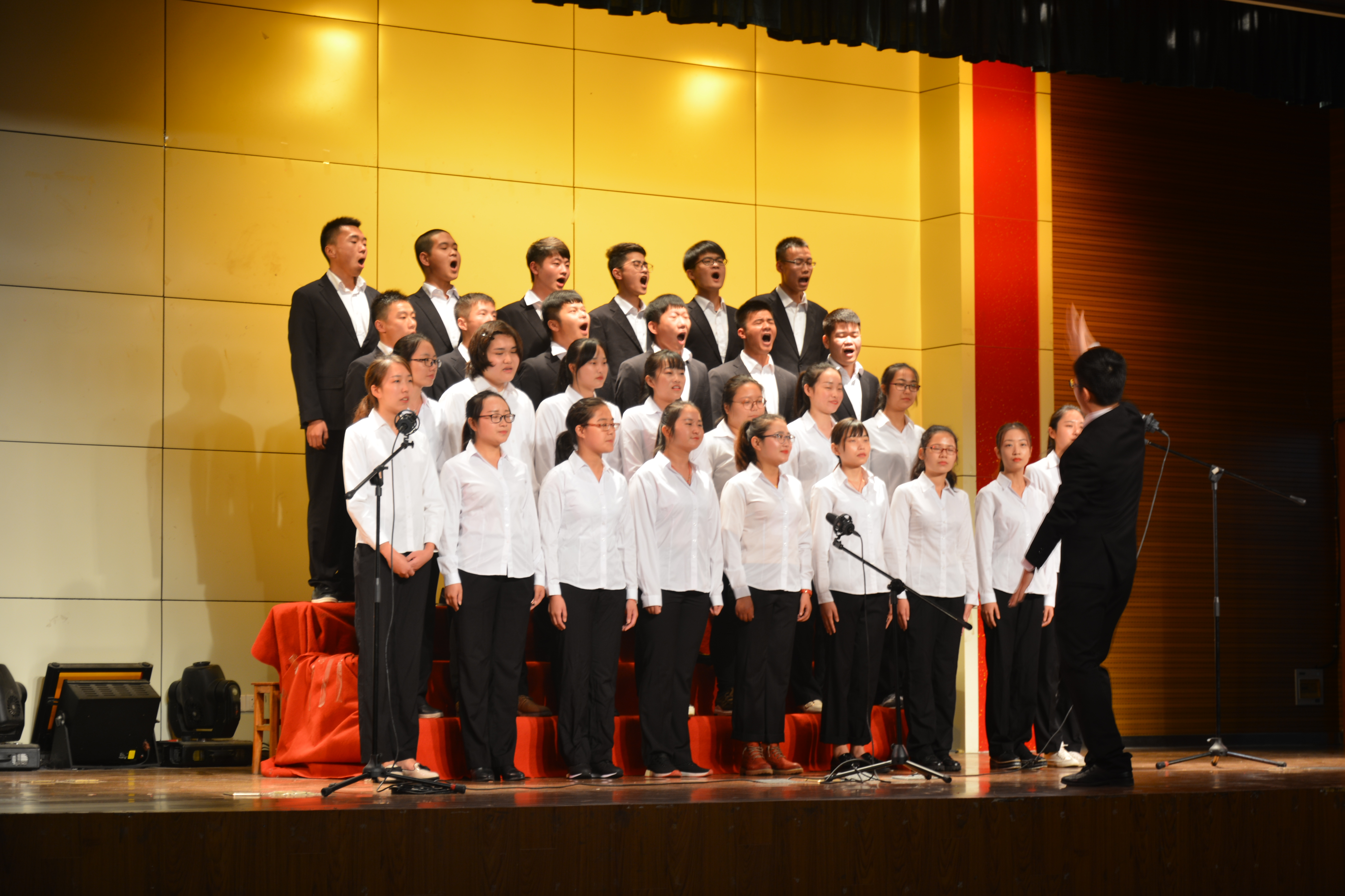 “五十六个星座五十六支花,五十六族兄弟姐妹是一家”,一首豪迈的《爱我中华》拉开了红歌赛的序幕。各团支部以朗诵、合唱、对唱等多种方式,放声高唱红色经典歌曲,《国家》、《没有共产党就没有新中国》、《强军战歌》、《我的中国心》、《红旗飘飘》等一首首经典红歌在礼堂内回荡。各参赛队伍着装整洁统一,随着伴奏、指挥高声演唱。他们以朴素青春的形象、铿锵有力的声音、生动活泼的表演表达了对党、对祖国的无限热爱和祝福,向大家展示了安农学子蓬勃向上、爱国爱党的情怀,向迎接党的十九大胜利召开献礼。