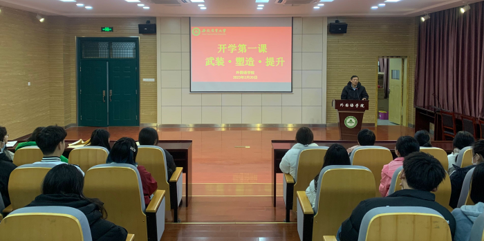 本网讯 人勤春来早,恰是学习奋发时。为进一步做好学生思想政治教育工作,提振学生新学期的信心,2月20日,外国语学院“开学第一课”在502报告厅顺利举行,学院党委书记方章东担任主讲,全体2022级学生参加本次活动。