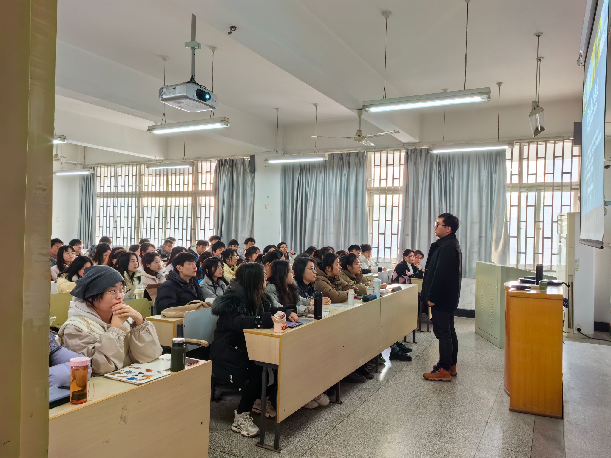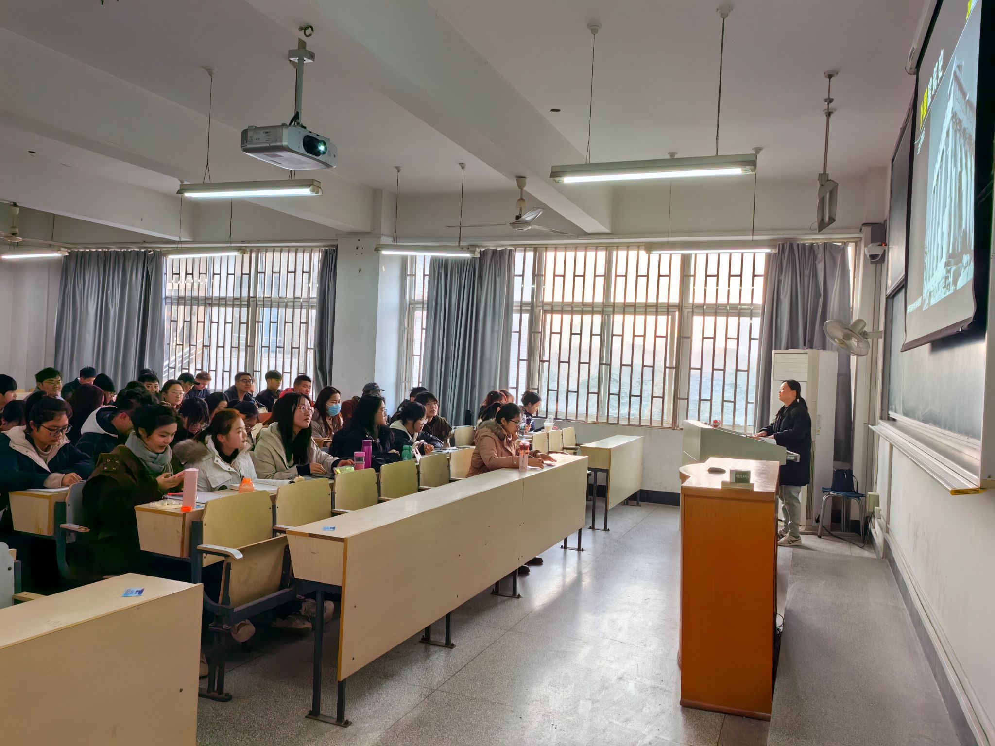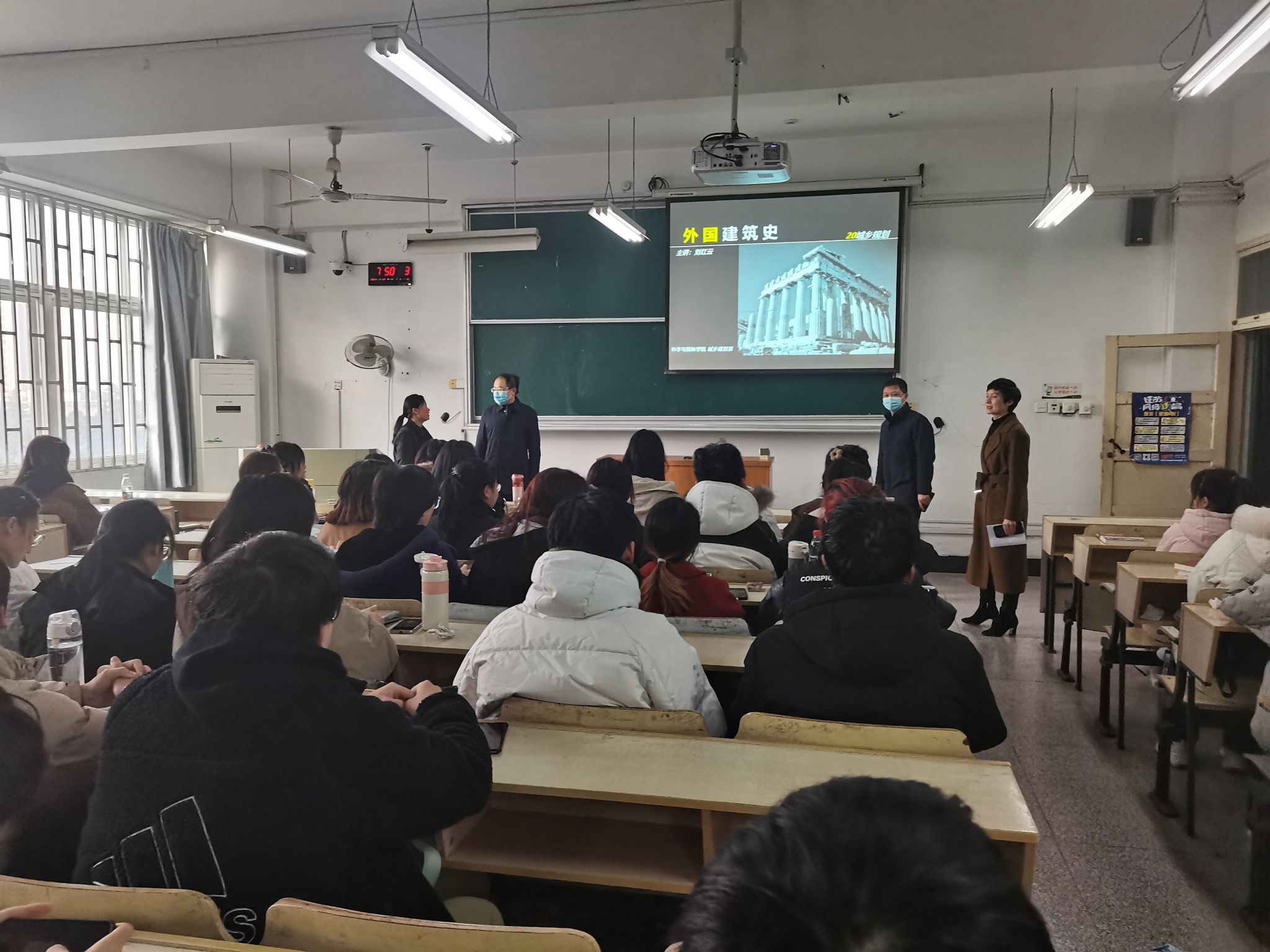 从学院周边到勤政楼前后,从东区到西区,从校内到大学生公寓,李春涛老师边走边说,两个多小时的时间里,详细讲述每一处环境变化背后的专业理念、人文价值,同学们边听边看,在徒步行走中脑海中的画面越来越丰富和立体。
