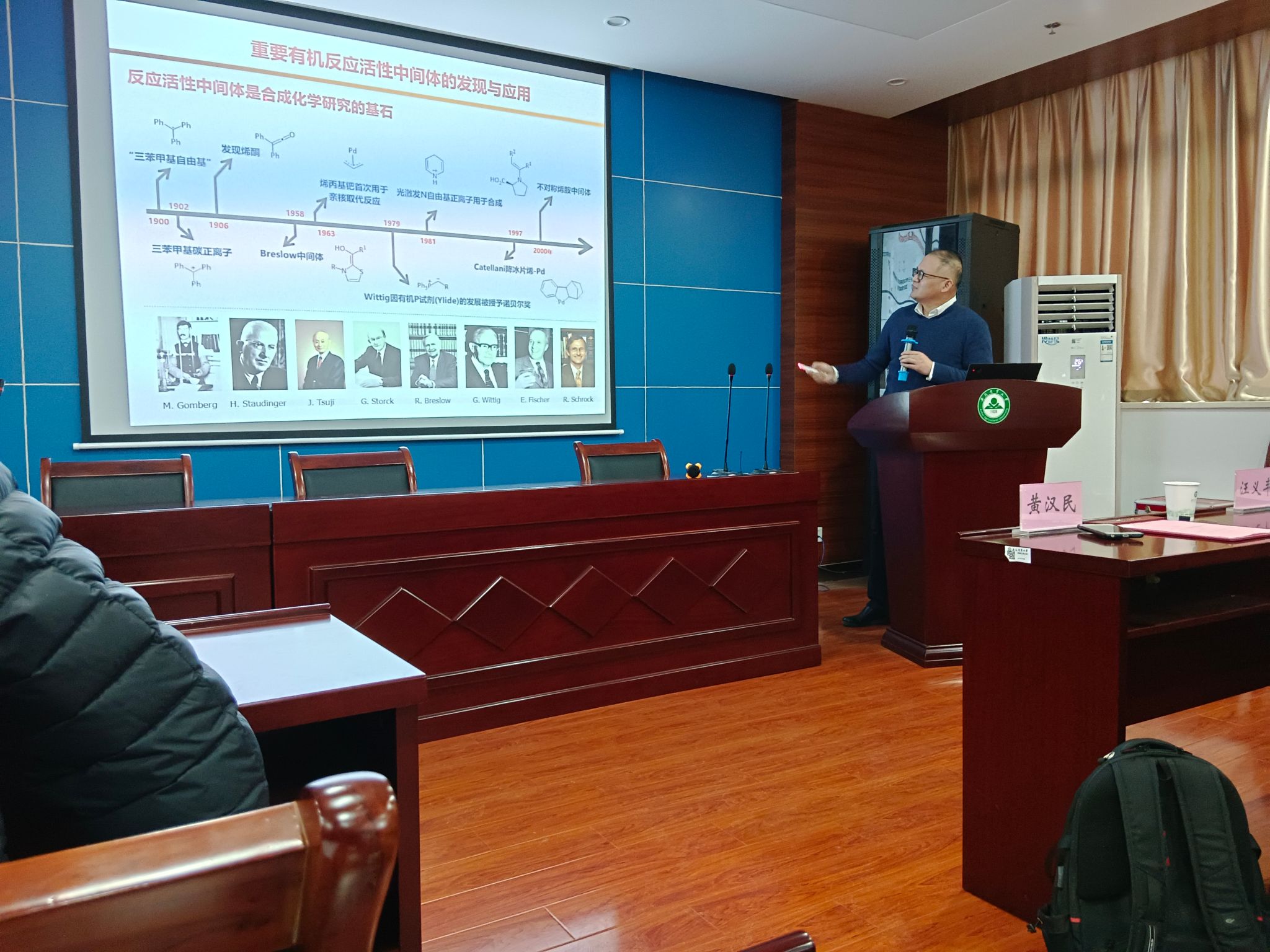 两位教授分别作了题为“一类新型先导活性钯络合物的发现及其导向的催化反应”和“铜催化有机硅合成研究”的学术报告。两位教授的讲解深入浅出、生动有趣,既有理论高度,又有实践方法,内容充实,在场师生都深受启发。在现场交流讨论互动环节,师生就科研中存在的疑问积极踊跃提问,气氛活跃,讨论热烈。