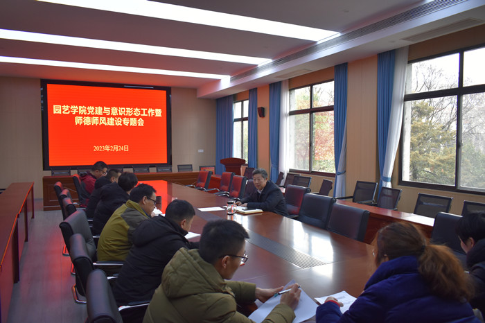本网讯 2月24日下午,园艺学院在二教326召开党建与意识形态工作暨师德师风建设专题工作会议。学院党政领导、系主任、党支部书记、两办人员和全体辅导员参加会议。会议由学院党委书记朱绍友主持。