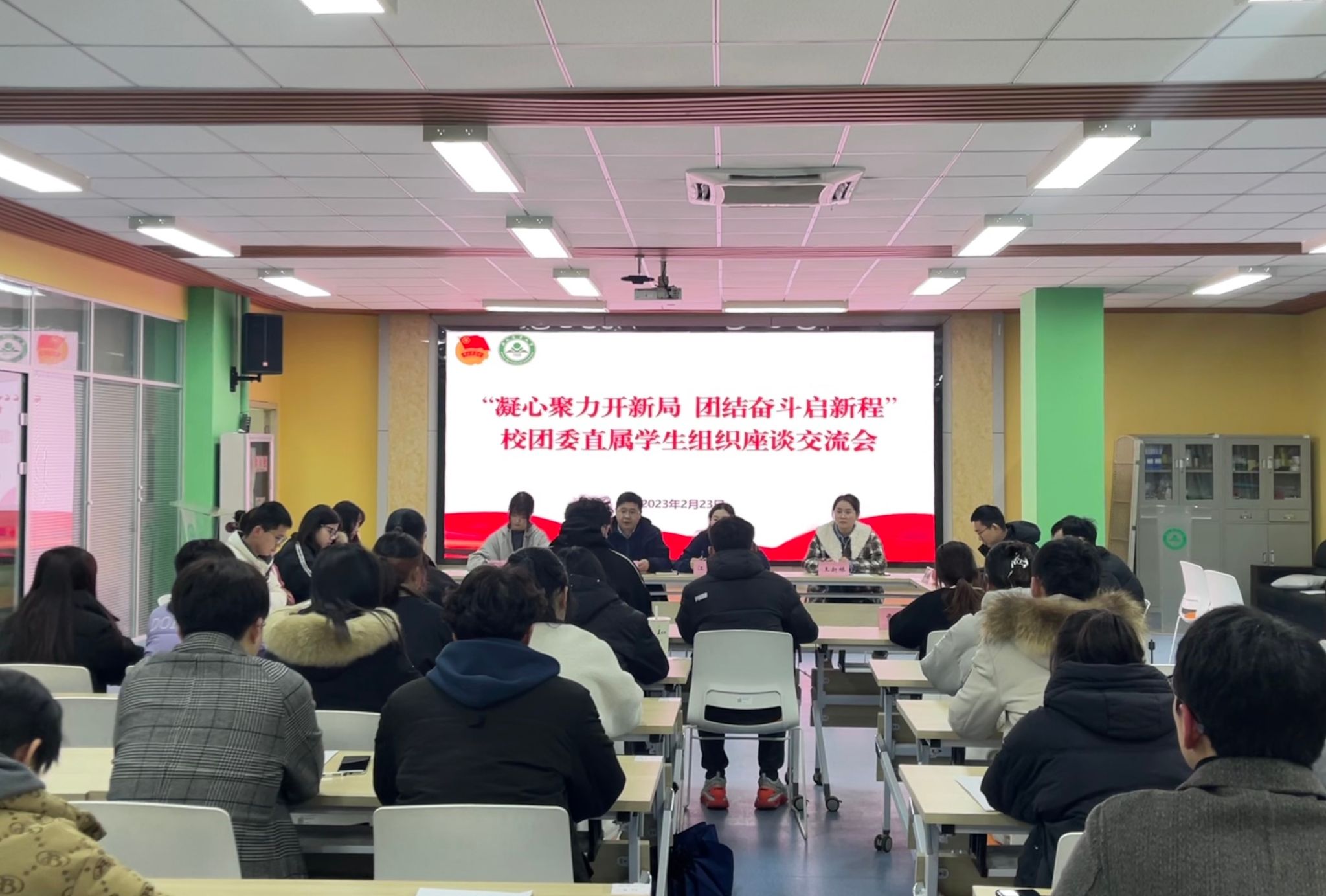 本网讯 为学习宣传贯彻党的二十大会议精神,提高校级学生组织服务水平。2月23日中午,校团委直属学生组织负责人座谈会在大学生创客空间路演大厅召开,校团委全体工作人员及各学生组织主要负责人参加会议。会议由校团委书记林煦东主持。