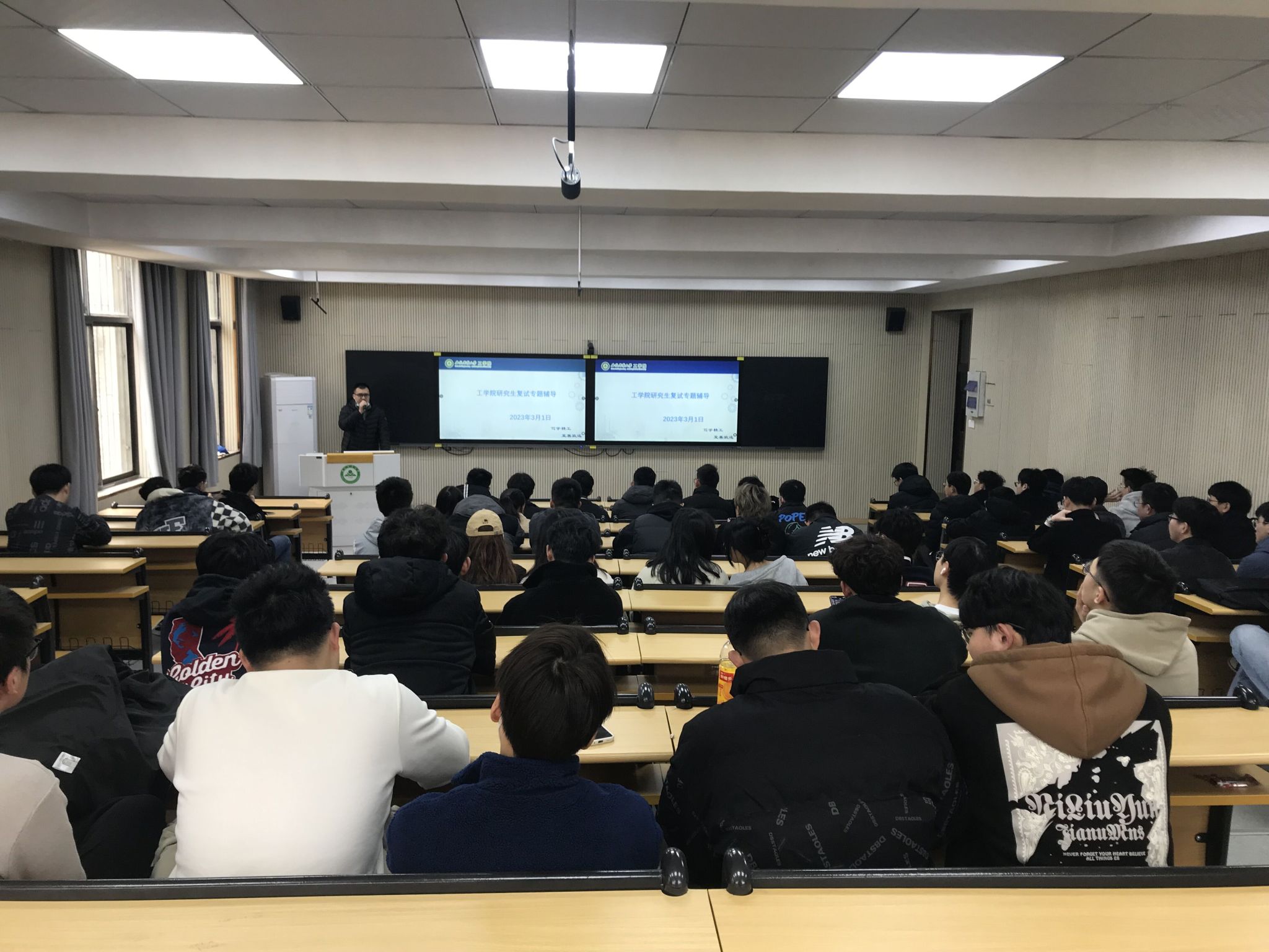 本网讯 为积极回应毕业班学生需求,扎实推进“我为学生办实事”活动,3月1日,工学院在三教101教室举办研究生复试指导会,邀请校研究生招生办负责老师与毕业班考研的同学现场互动交流。学院党委副书记、副院长张国学参加会议。